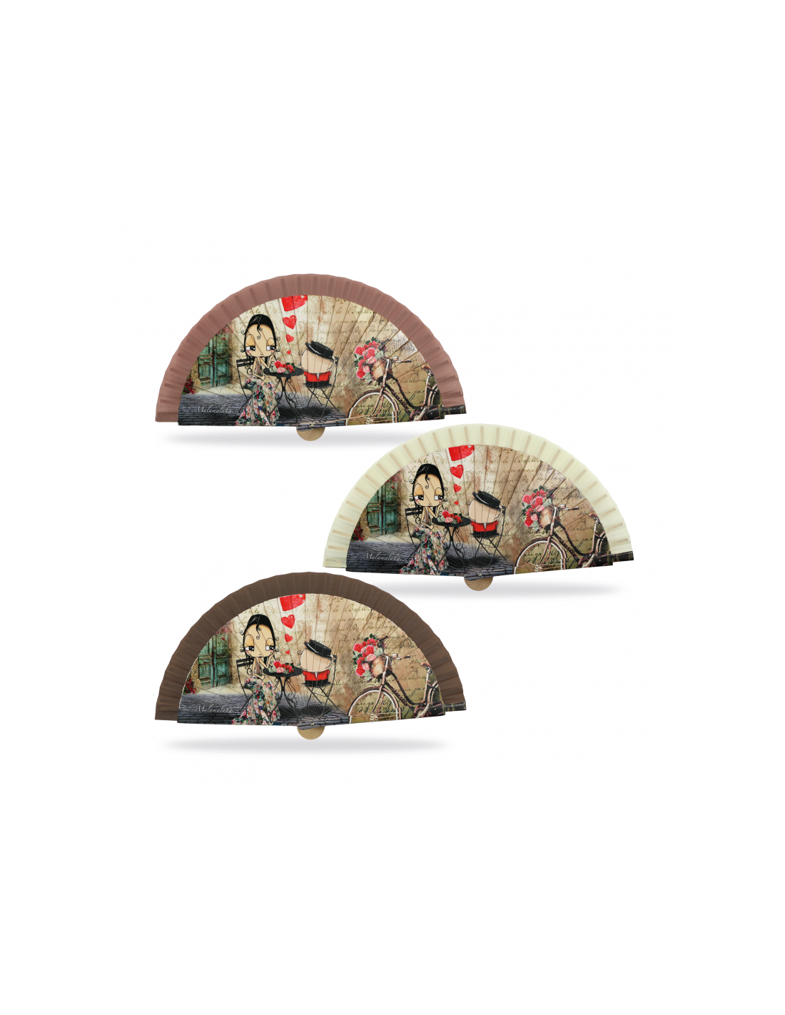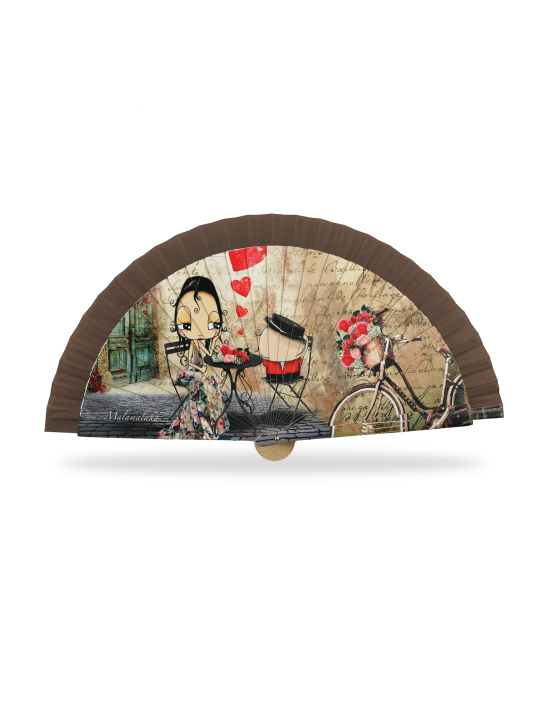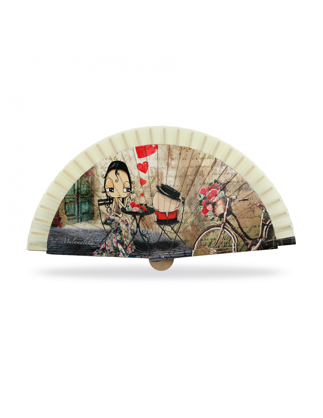 Este abanico ilustrado por Malamalaka tiene un diseño único inspirado en una cena romántica con tonos vintage.