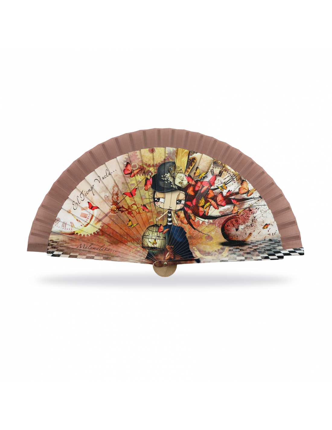 Este abanico ilustrado por Malamalaka tiene un diseño único inspirado en el tiempo, con tonos cálidos de marrón y beige.