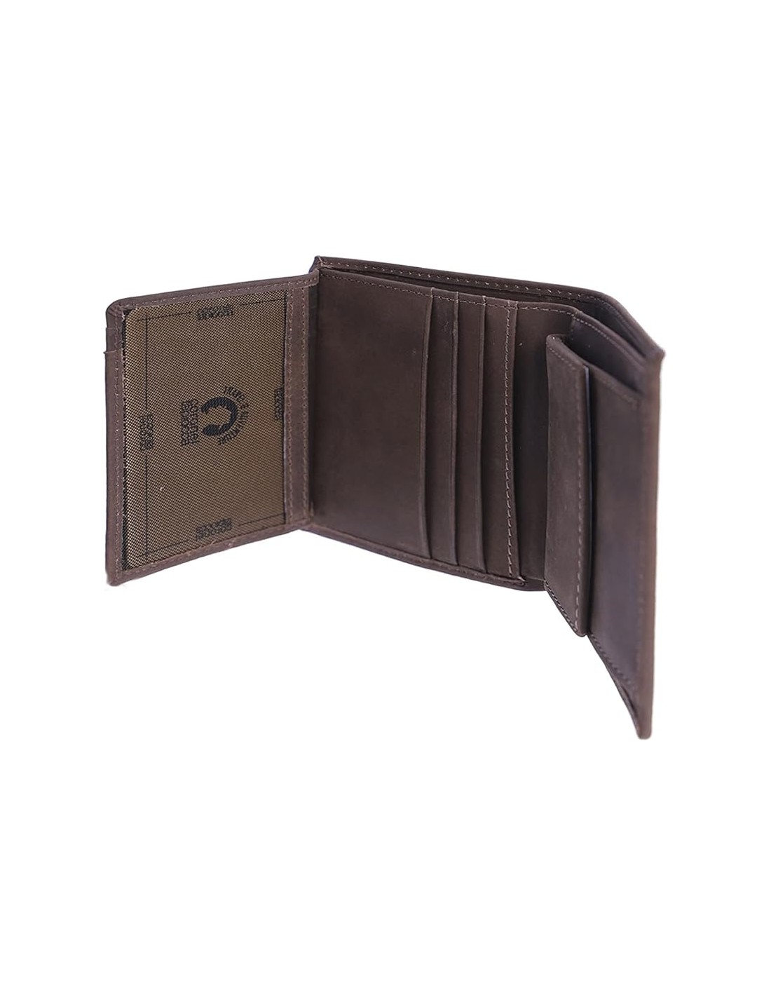 Piel vacuno de primera calidad. 6 ranuras para tarjetas. Bolsillo con solapa y cierre de click para monedas. 1 ranura para billetes. 1 departamento para