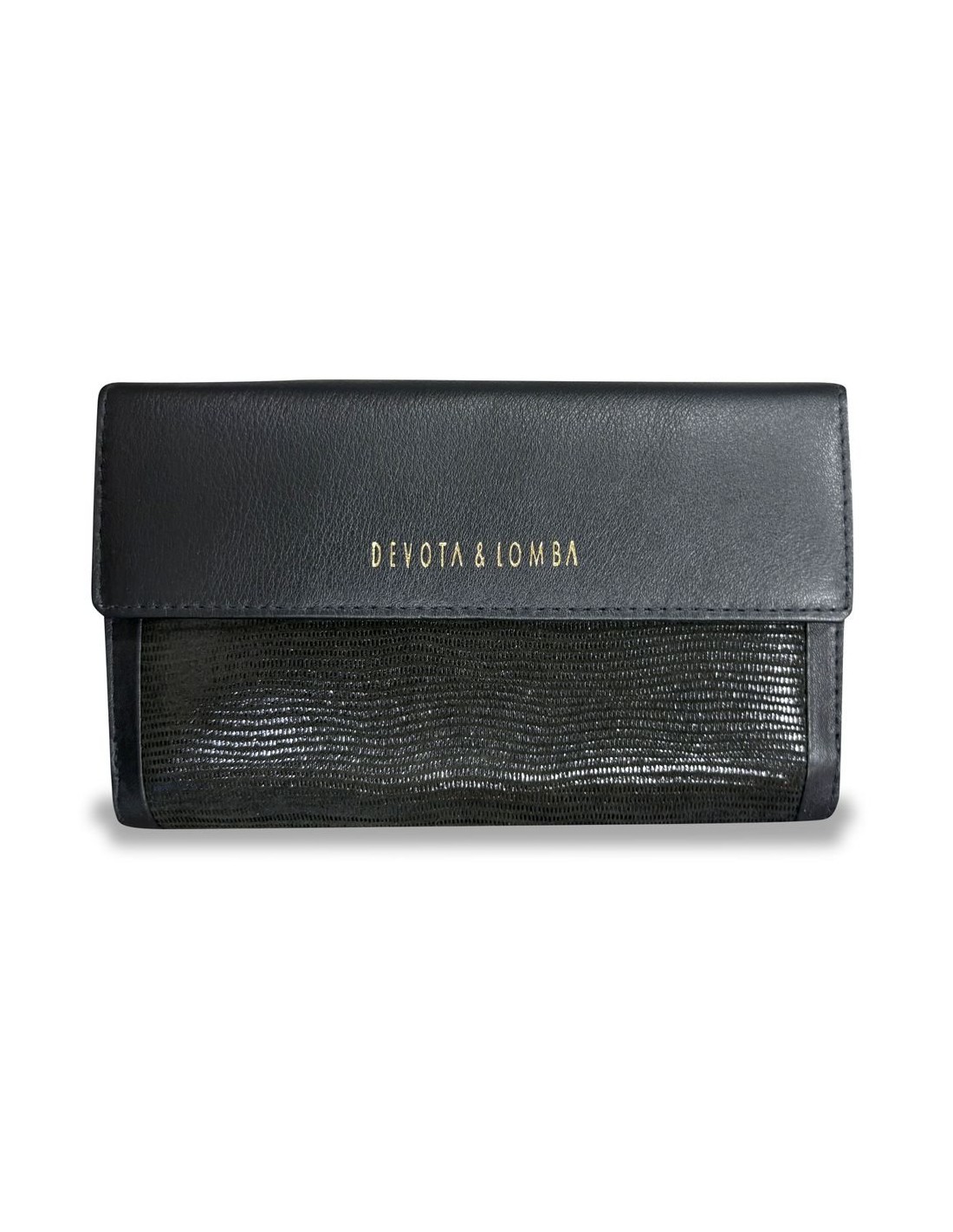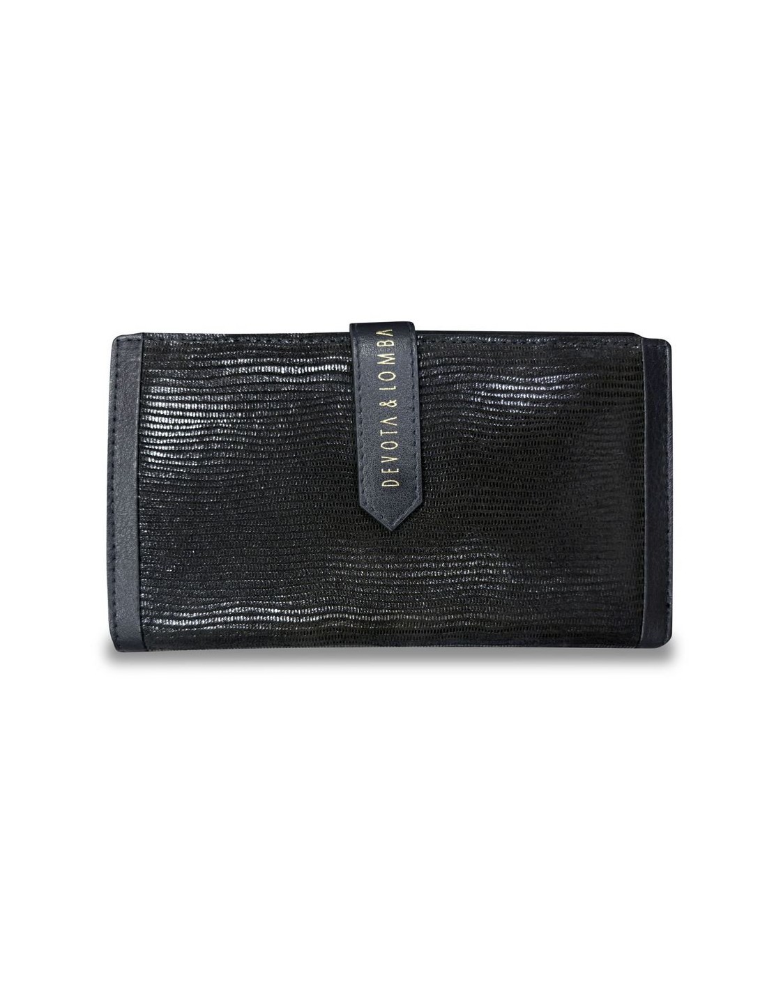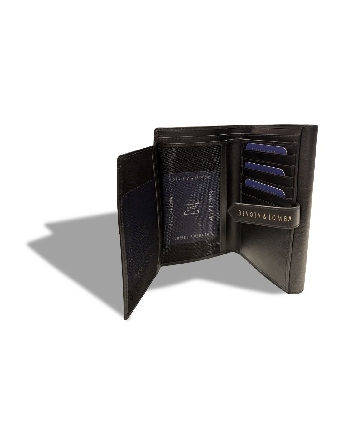 Cartera billetera larga de piel de la marca Devota & Lomba. Cartera con monedero con cierre solapa con broche. Otro apartado con cierre de solapilla con broche con varios apartados para tarjetas, dos con rejilla ideal para fotos o DNI y dos apartado para billetes.