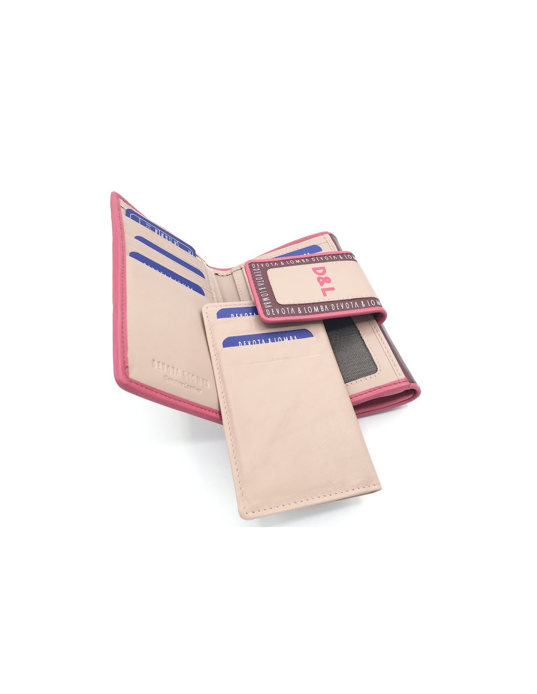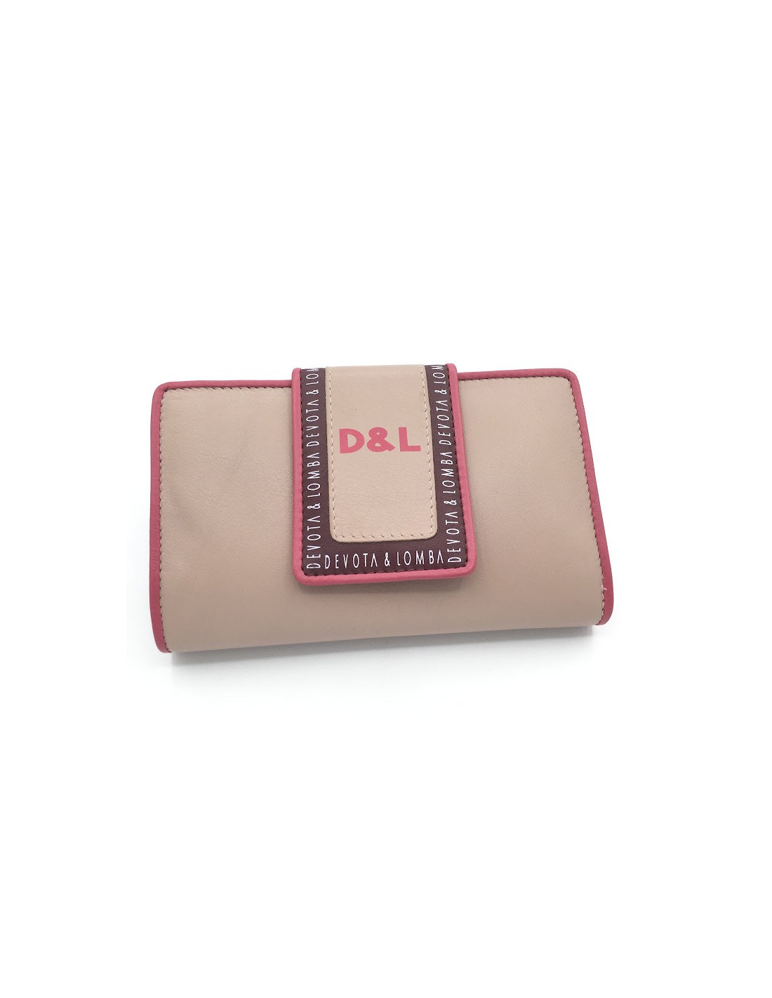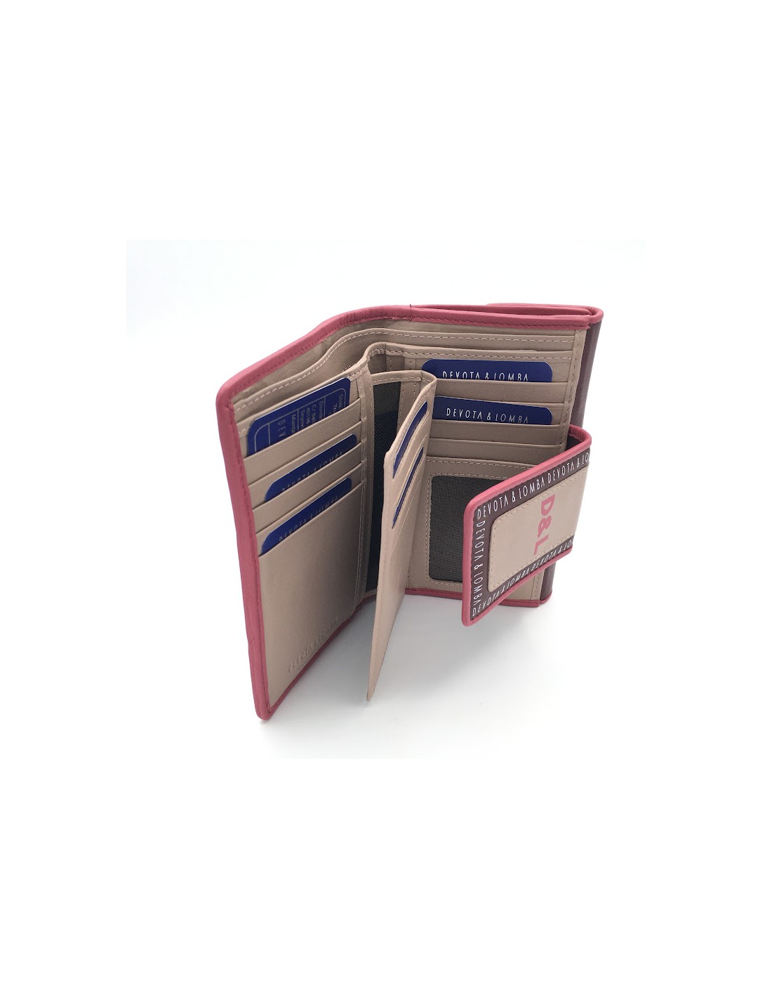 Cartera billetera de piel de la marca Devota & Lomba. Cartera con monedero con cierre solapa con broche y en su interior un apartado con cremallera. Otro apartado con cierre de solapilla con broche con varios apartados para tarjetas, varios con rejilla ideal para fotos y DNI y dos apartado para billetes.