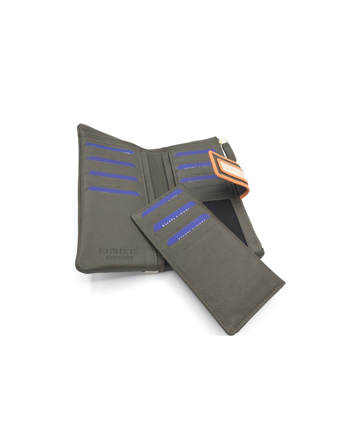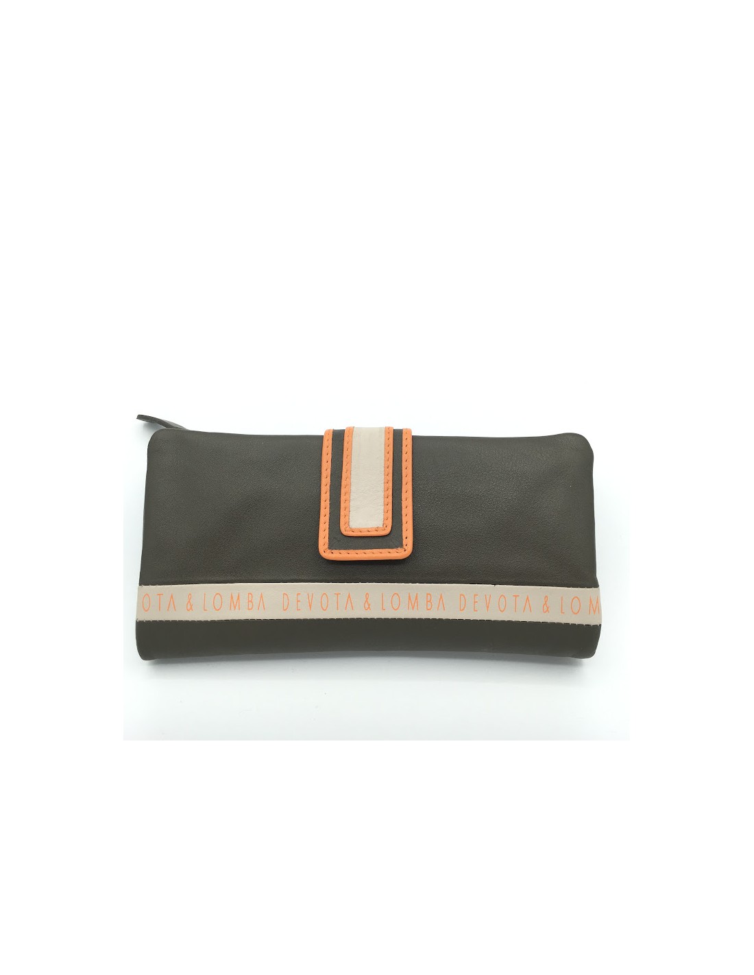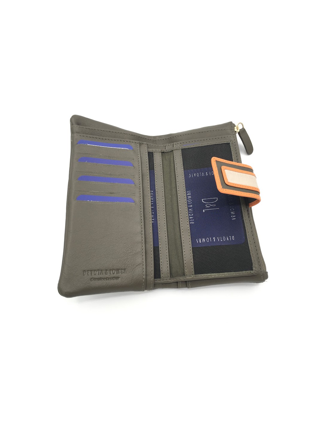 Cartera billetera de mujer en piel de la marca Devota & Lomba, tamaño mediano , dispone de monedero con cremallera, cierre con solapilla con cierre tipo broche. En su interior varios departamentos para tarjetas, y doble apartado para billetes, dispone también de un extraíble para tarjetas, apartados con rejilla ideal para DNI.