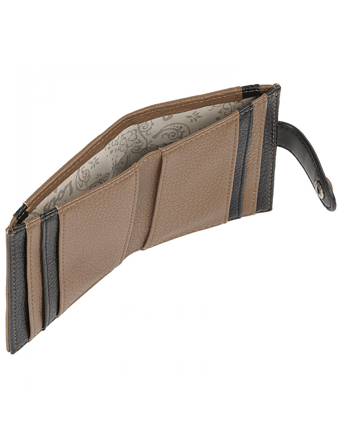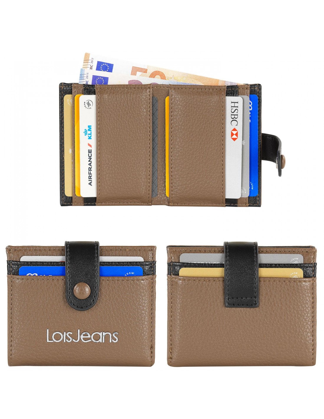 Con acabados perfectos, combina dos colores. Apartado para billetes y 12 ranuras para tarjetas.