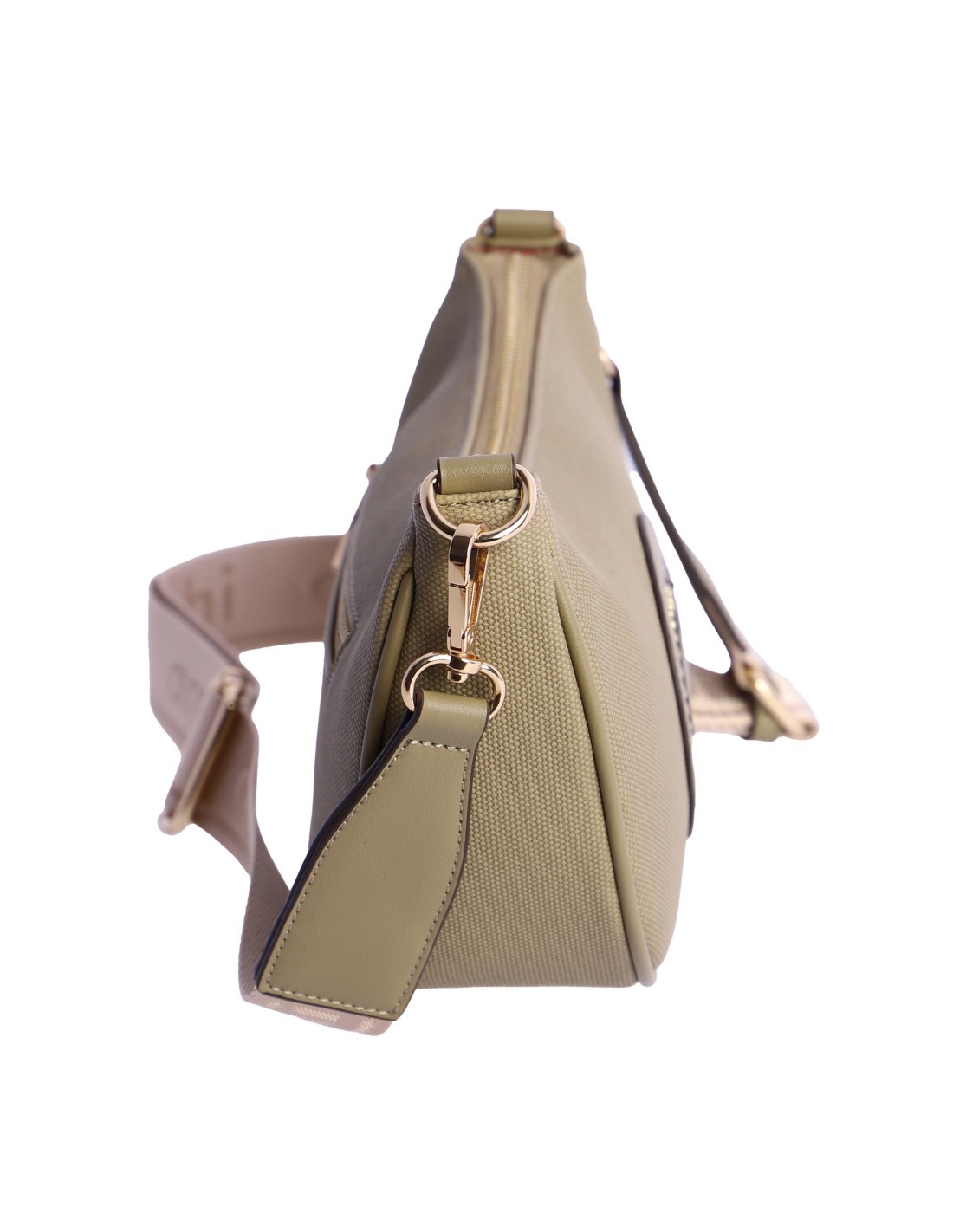 Bolso bandolera para mujer AMICHI Sol de material de piel sintética decorado con un logo perforado en una pieza redonda de piel sintética con detalles metálicos en plata en la parte frontal. Tiene cierre de cremallera con tirador metálico con logo, dispone de tres bolsillos interiores, dos delante y uno detrás con cremallera, más otro exterior detrás también con cremallera. Medidas: 26(ancho) x 8fondo) x 15(alto)cm.