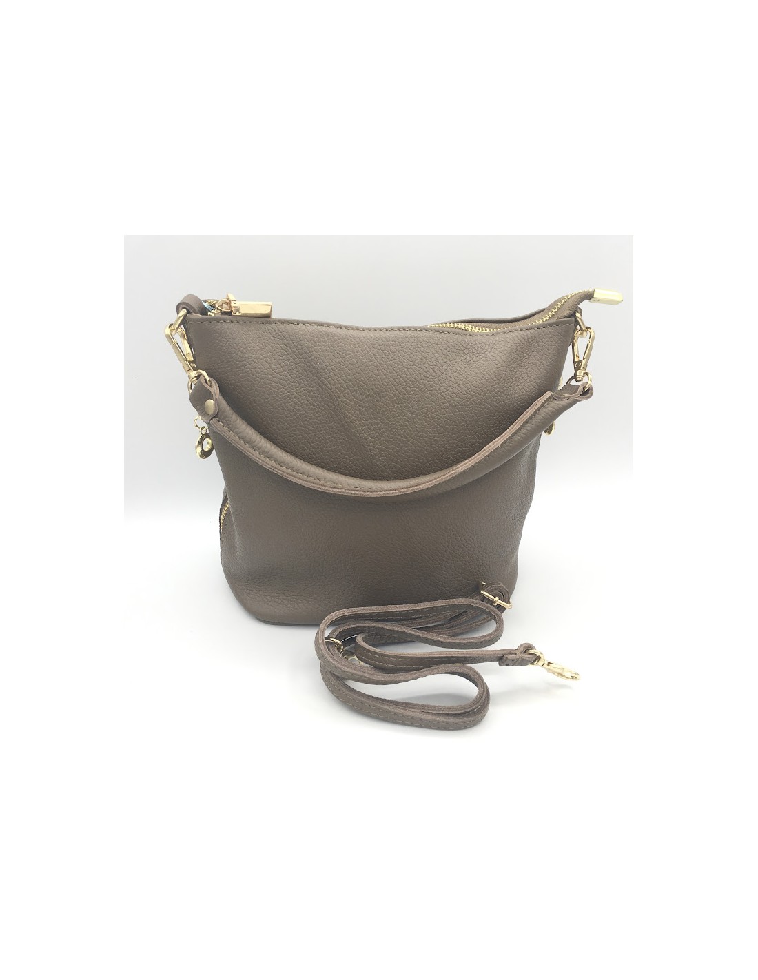 Bolso pequeño con asa corta y bandolera ajustable, fabricado en piel granulada de varios colores. Tiene cierre de cremallera y cremalleras laterales de adorno.