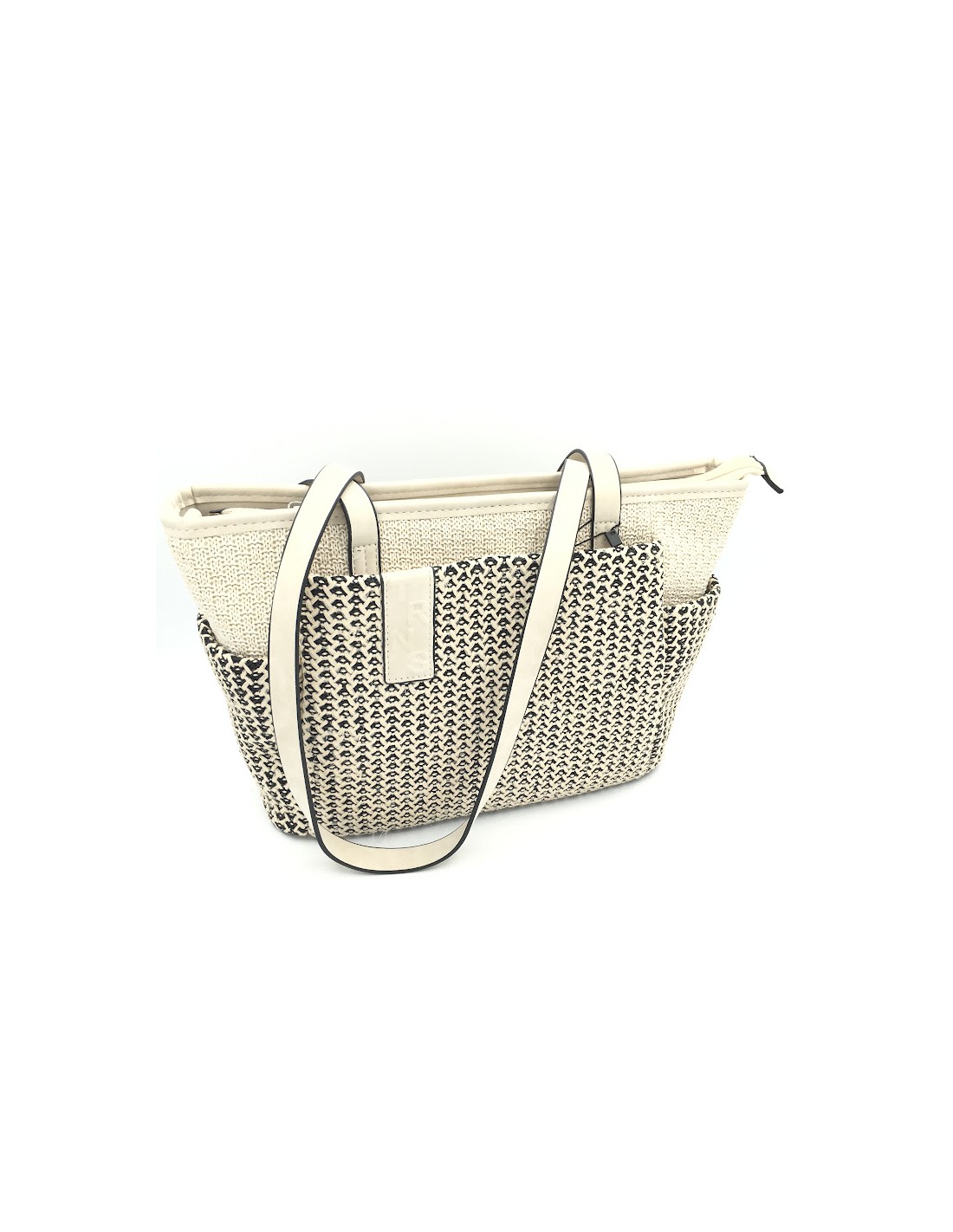 Confeccionado en rafia sintética con remates en polipiel, este bolso destaca por su textura sofisticada y diseño versátil.