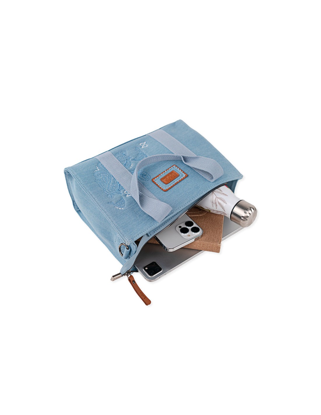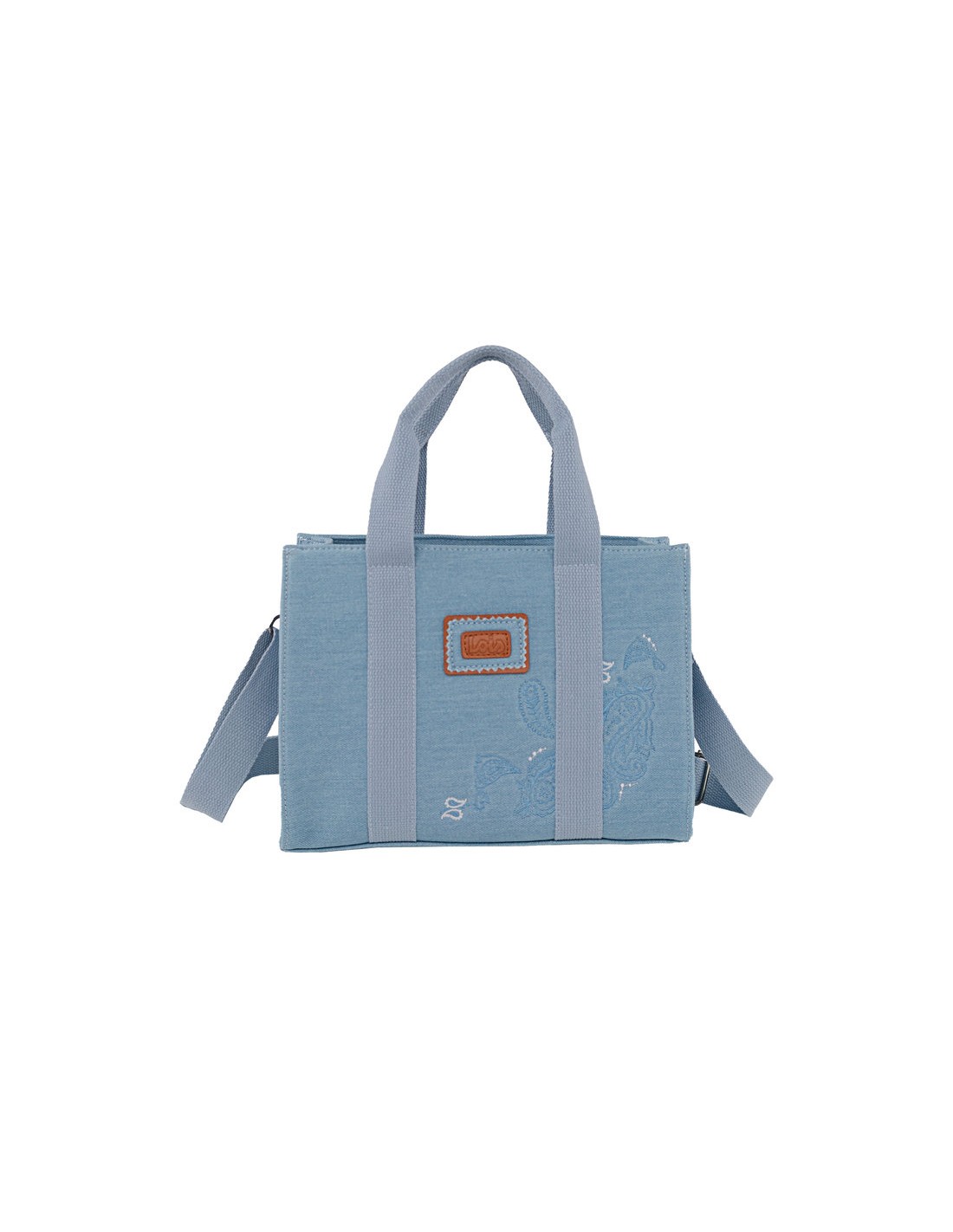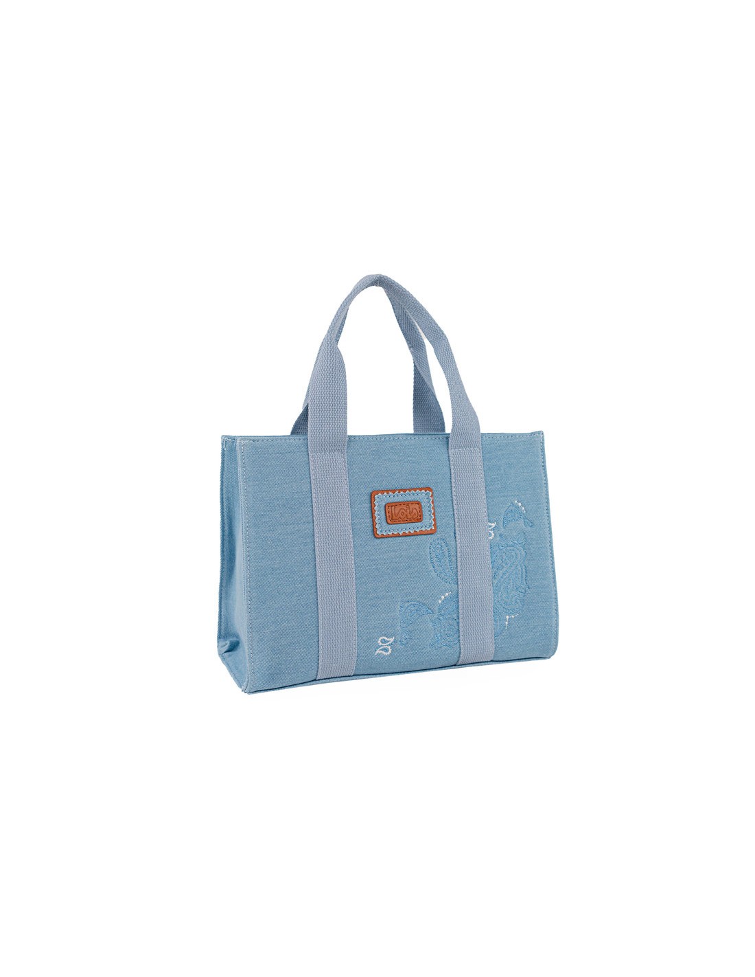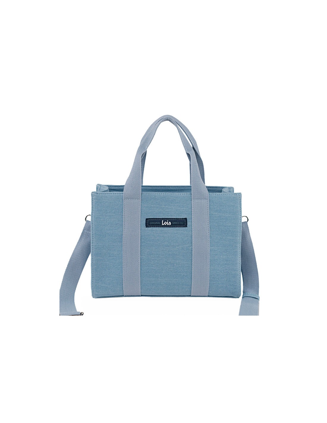 Bolso con dos asas de mano y bandolera regulable, compartimento interior amplio.