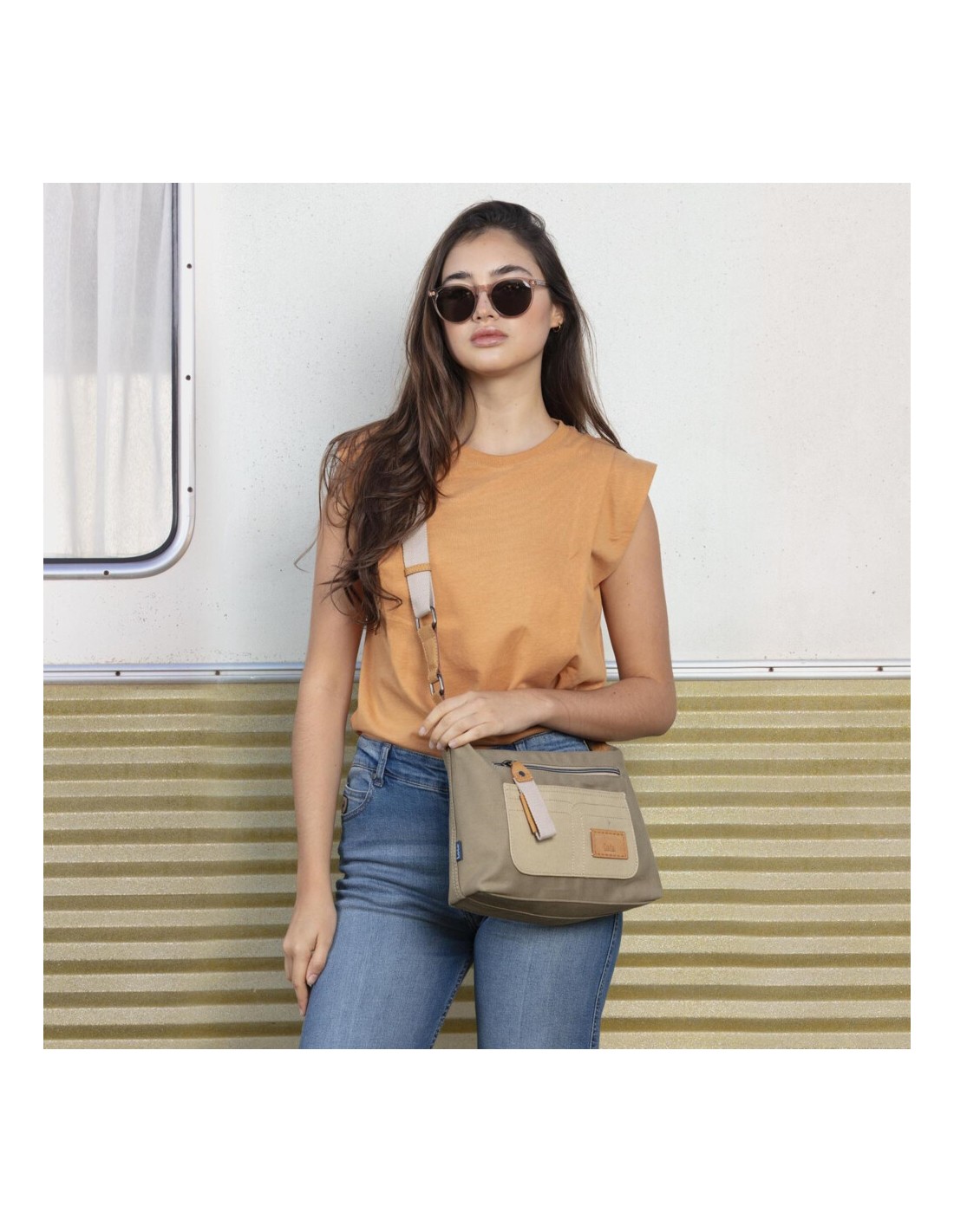 Bolso con bandolera regulable, compartimento interior amplio. Bolsillo trasero y delantero con cremallera.