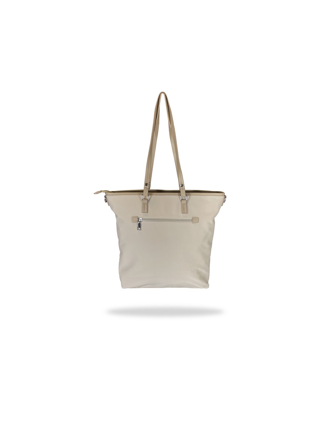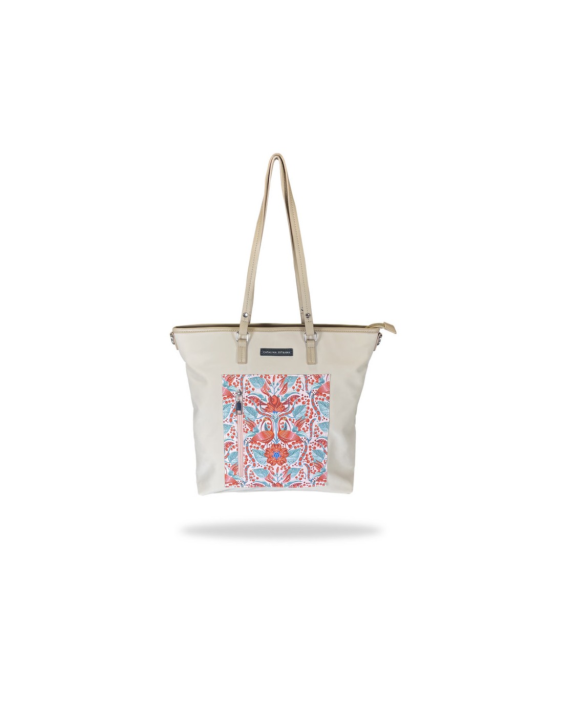 Bolso Shopper 2 asas de hombro mujer Catalina Estrada color taupe con bolsillo delantero y trasero.