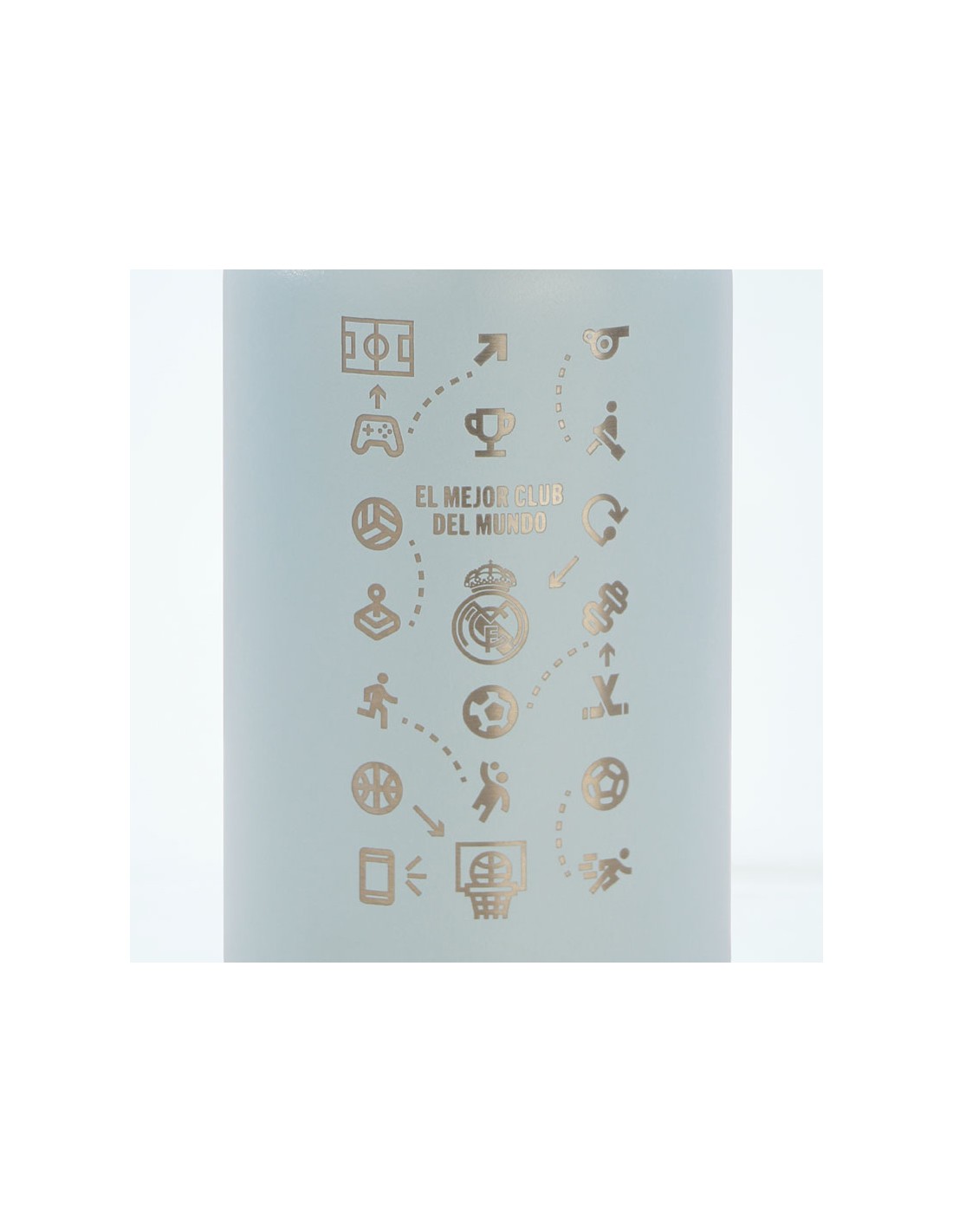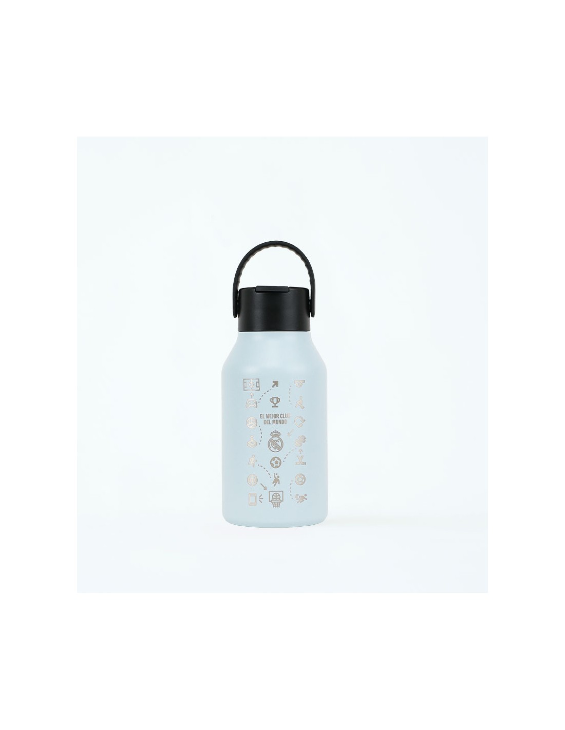 La botella Termo del Real Madrid 350 ml con recubrimiento cerámico y tapón roscado que mantiene tus bebidas frías durante 24 horas y calientes durante 12 para que te la lleves donde quieras.