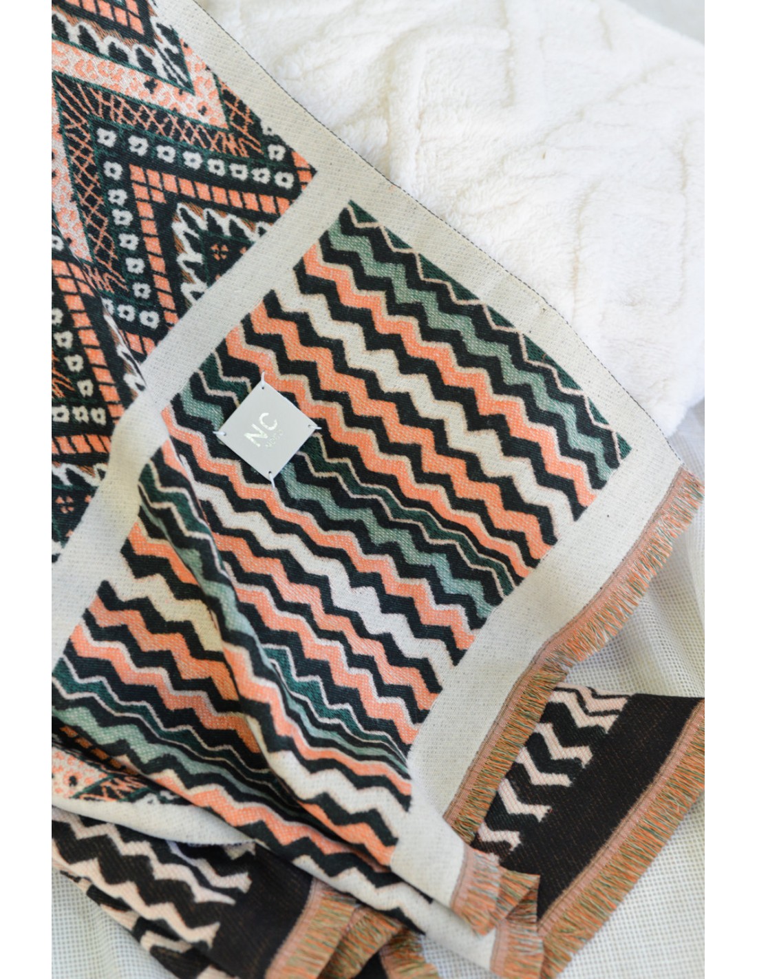 Bufanda pashmina rectangular de estampado lineas zigzag en distintos tonos con trasera del mismo estampado unicolor.