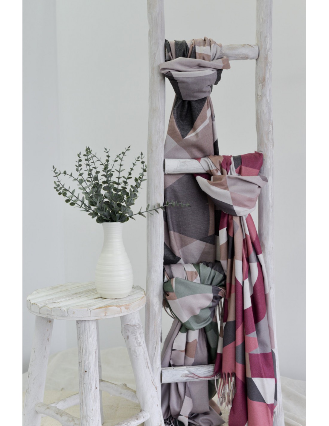Bufanda rectangular de estampado geométrico en distintos tonos con trasera de color único. Acabado en flecos.