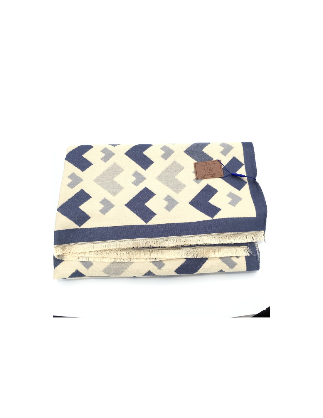 Bufanda en colores con dibujos geométricos y flecos cortos.