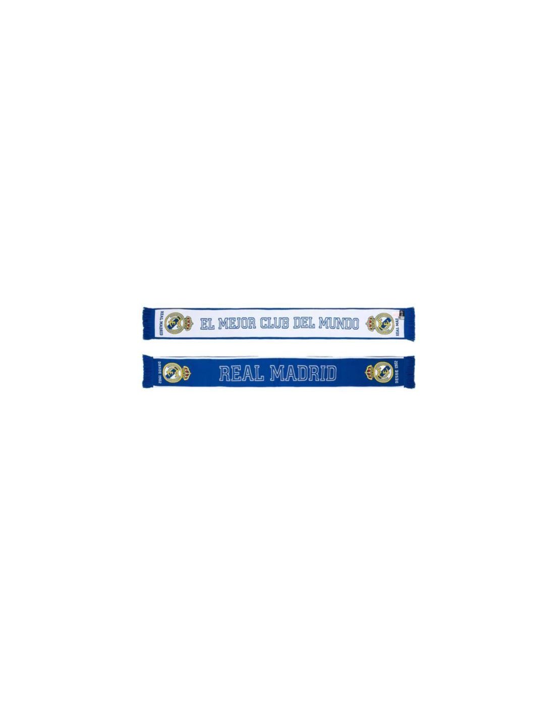 Bufanda Real Madrid, tela doble cara azul y cara blanca tejida mensaje EL MEJOR CLUB DEL MUNDO escudo extremos.