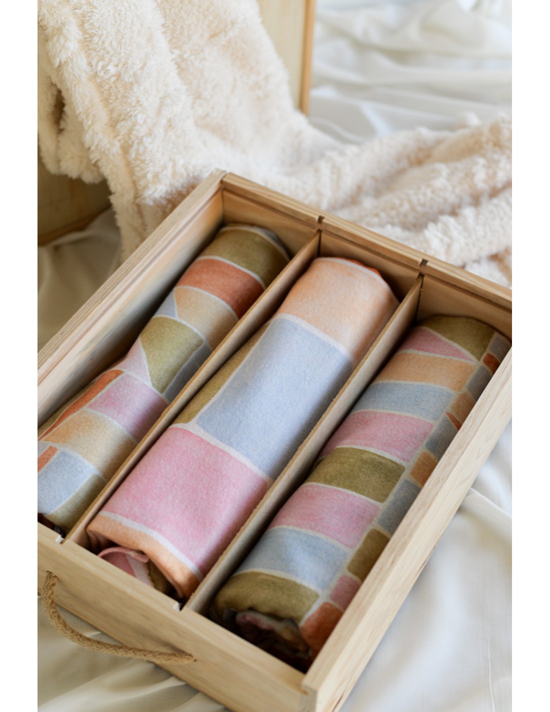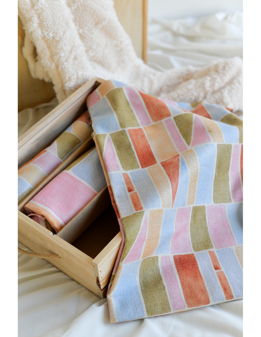 Pashmina reversible diseñada con estampado de formas geométricas en distintos tonos pastel en una de sus partes y por el otro lado en color liso.