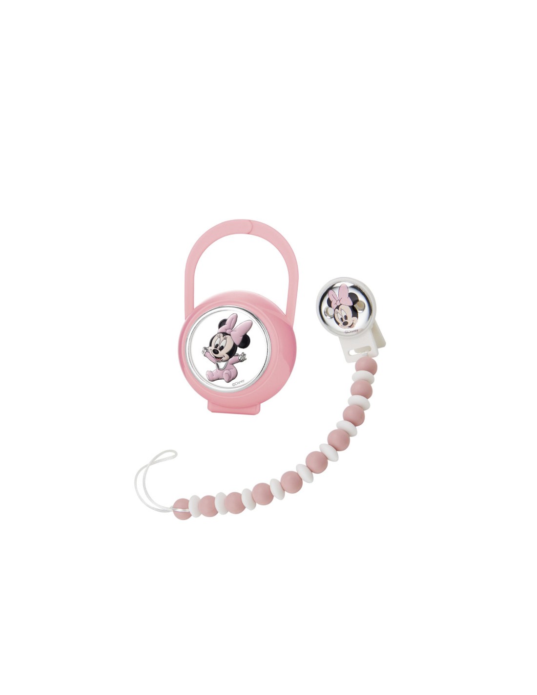 Set Portachupetes con pinza , con una chapa bilaminada de plata de ley, con dibujo de Minnie esmaltado a todo color.