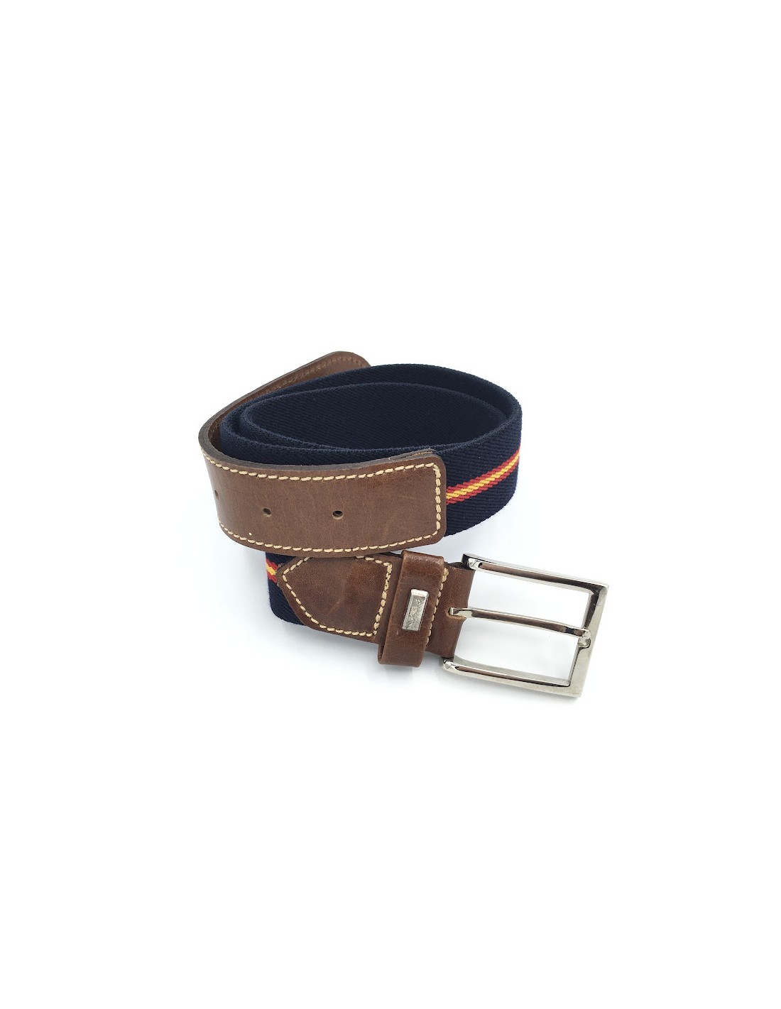 Cinturón Elástico de caballero. Piel color marrón y tela azul marino con los colores de la bandera de España.