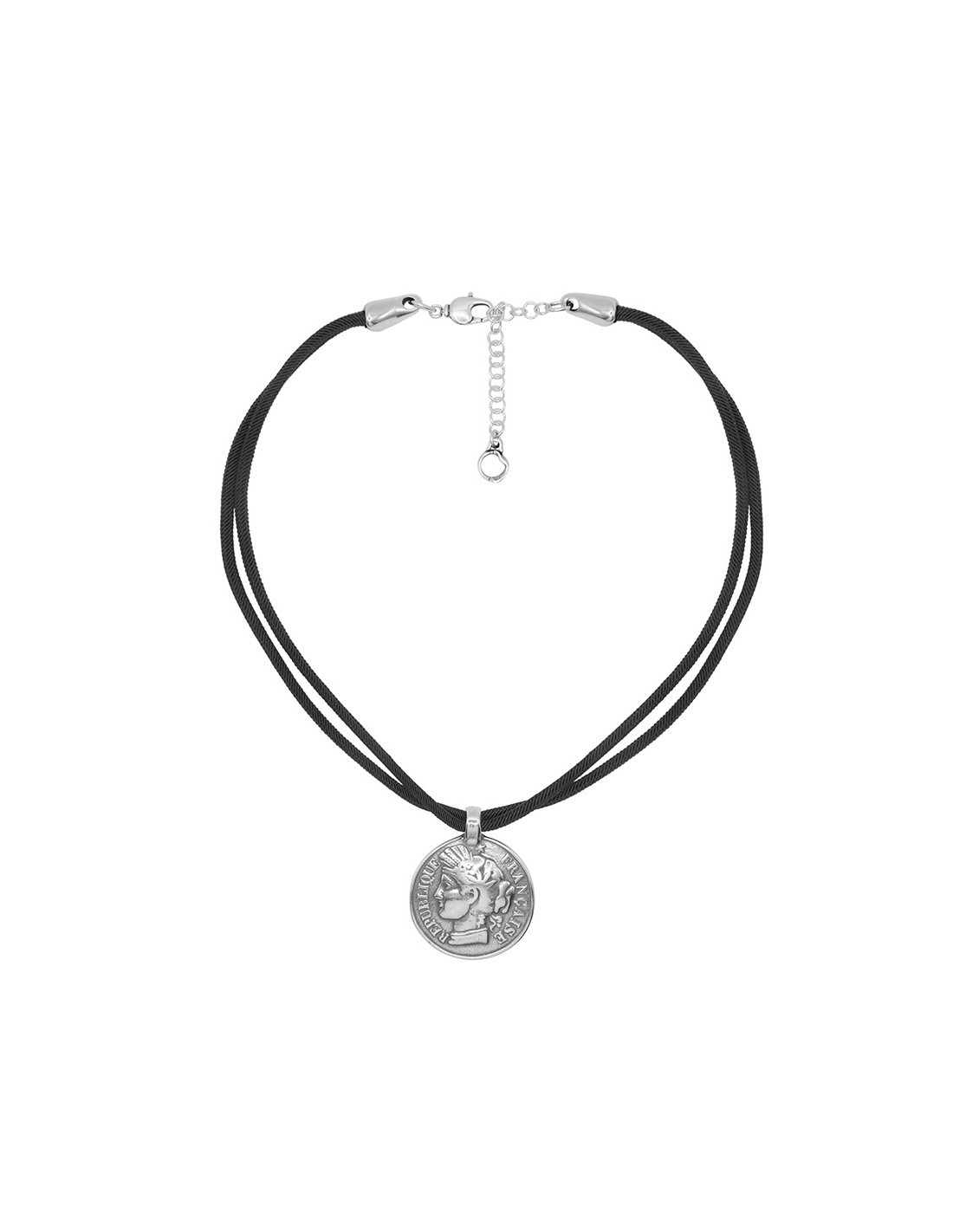 Combina un cordón doble de algodón negro y una pieza grande bañada en plata con diseño de moneda.