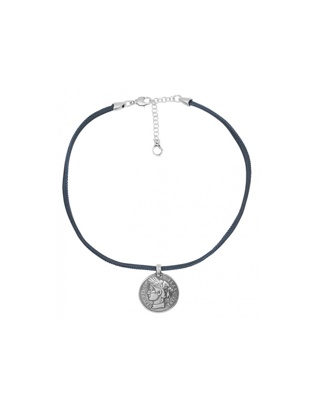 El collar corto Celine combina cordón de algodón azul tipo tejano con un motivo central grande bañado en plata con diseño de moneda.