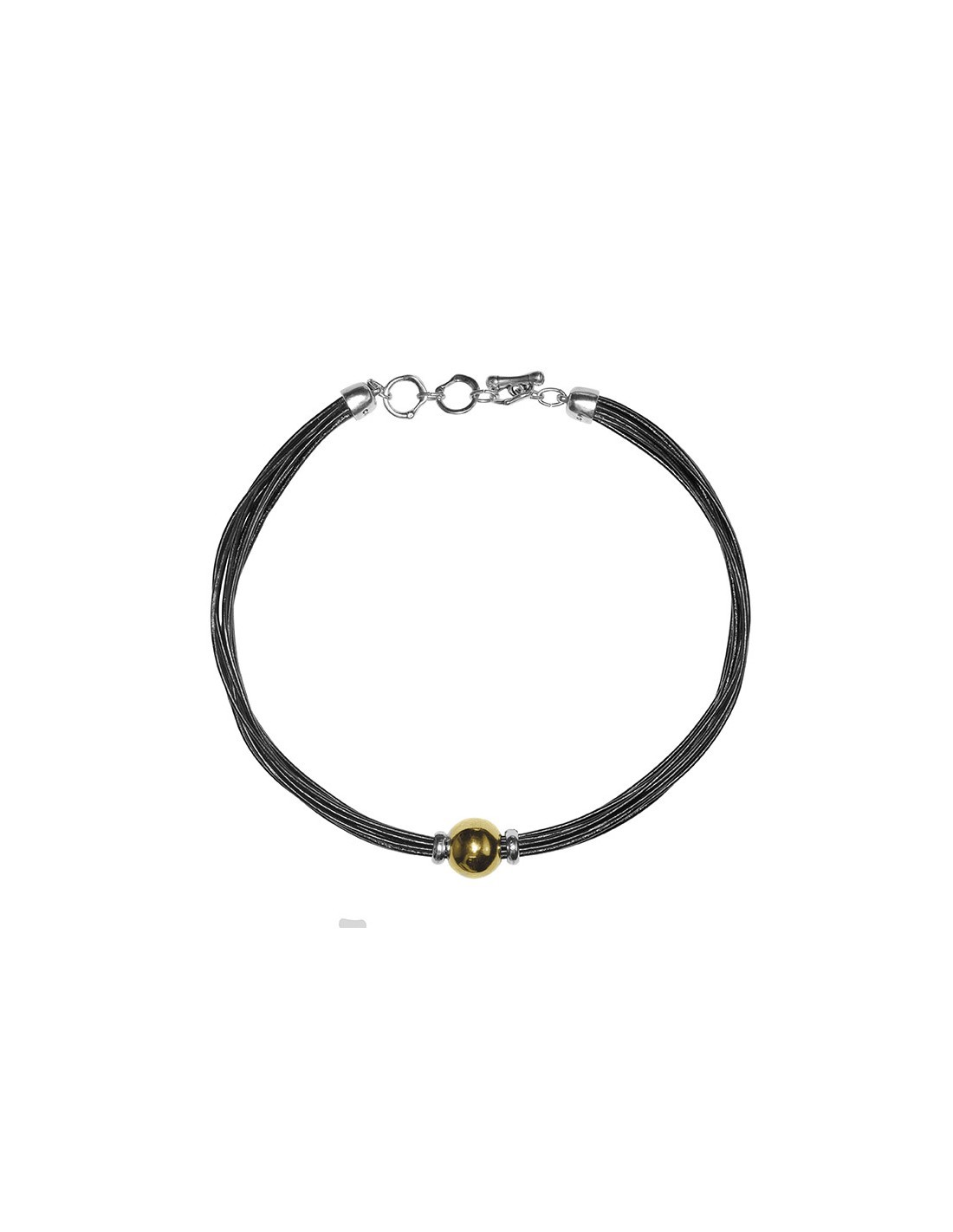 El Collar Juno Gold está compuesto por varios cueros de dos grosores y baño de plata, todos pasando por un motivo central en forma de esfera bañada en oro.