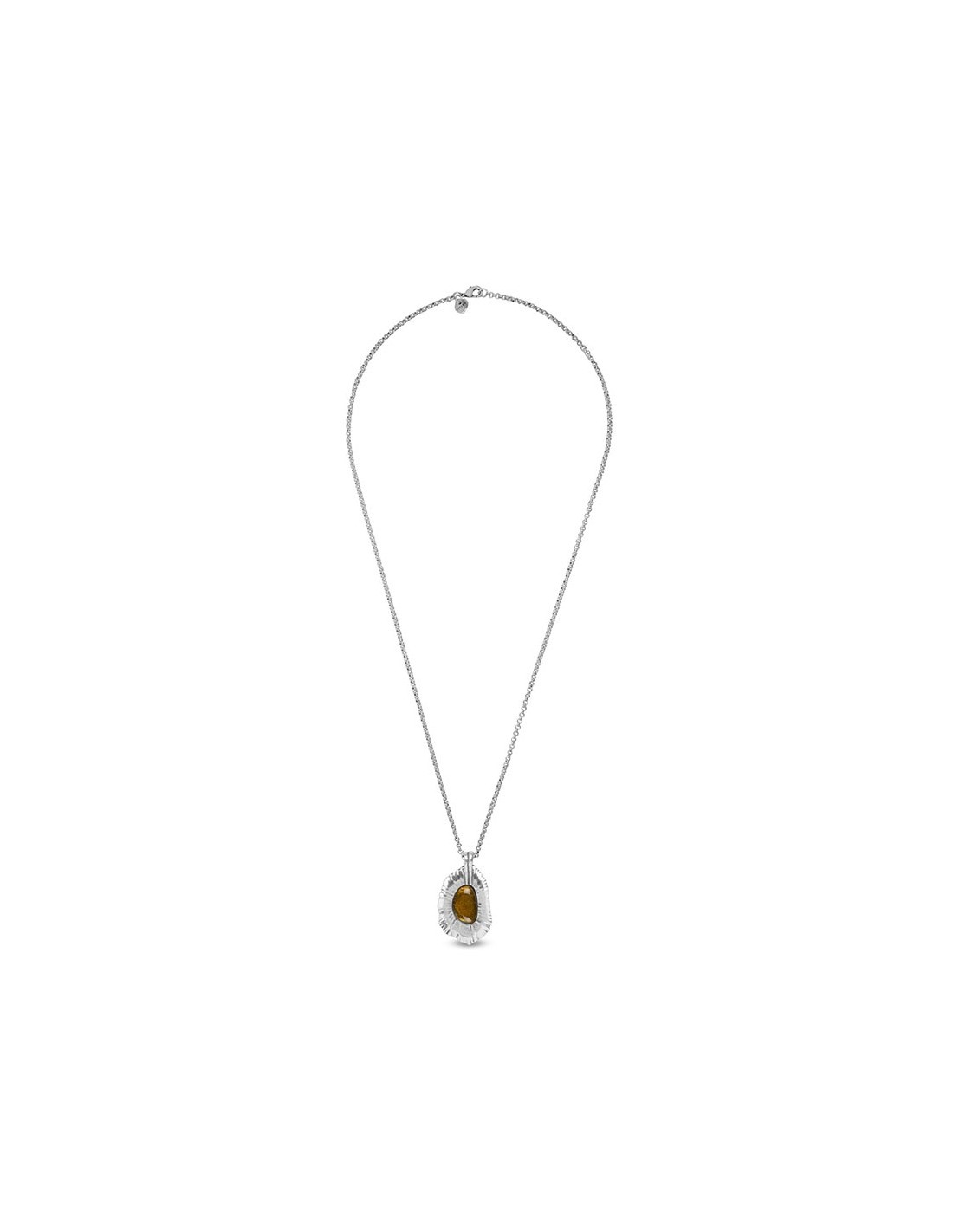 Collar largo de cadena, colgante de metal bañado en plata con cristal artesanal de Murano color ámbar en un diseño original de Ciclón.