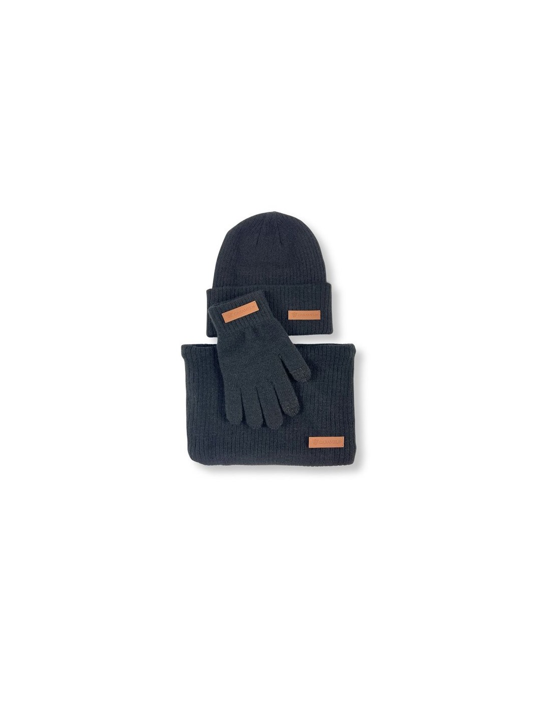 Set de punto negro, consiste en un conjunto de gorro ,cuello con forro de terciopelo y unos guantes de Pantalla Táctil, con material conductor de alta sensibilidad en el pulgar, el índice y el dedo medio. con un tacto muy suave.