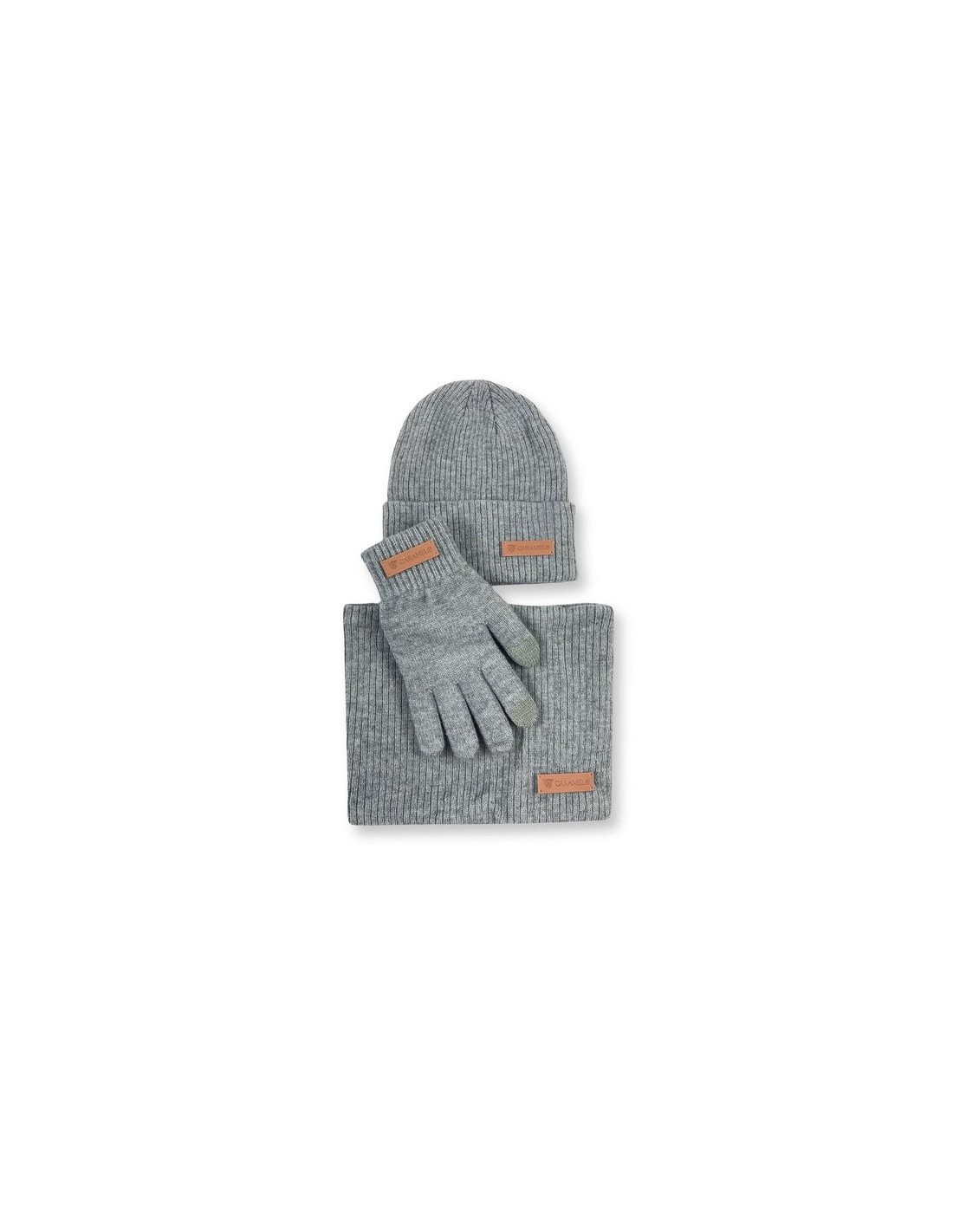 Set de punto gris, consiste en un conjunto de gorro ,cuello con forro de terciopelo y unos guantes de Pantalla Táctil, con material conductor de alta sensibilidad en el pulgar, el índice y el dedo medio. con un tacto muy suave.
