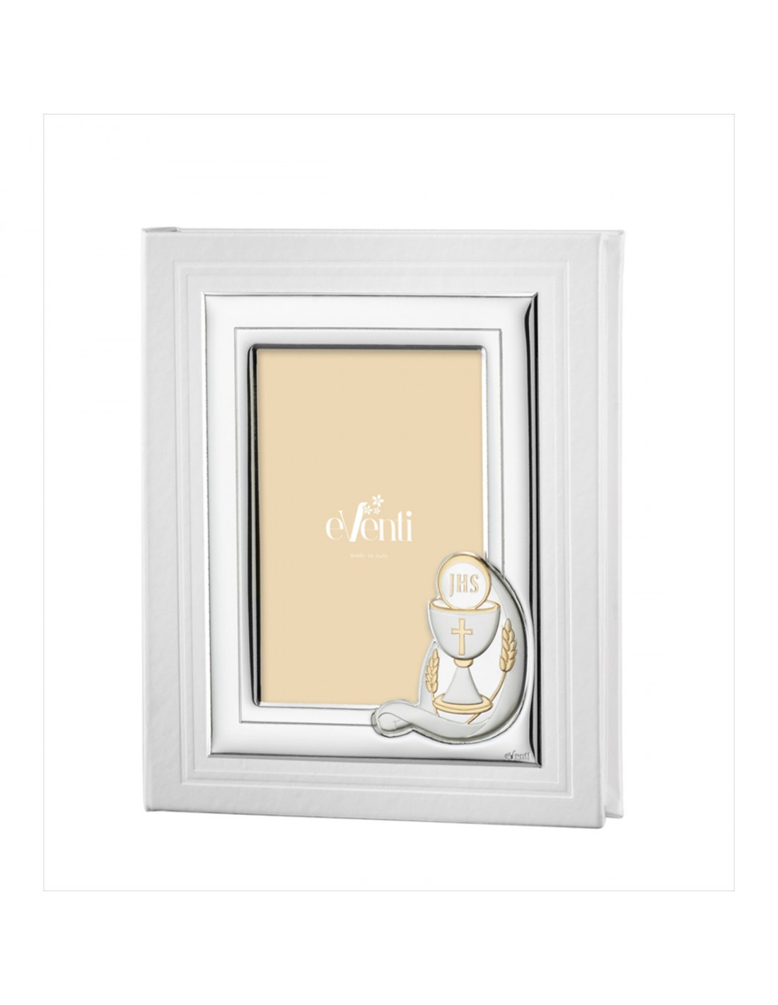 Álbum recuerdo de tu primera comunión, con marco para foto, Bilaminado en plata de ley con detalles dorados.