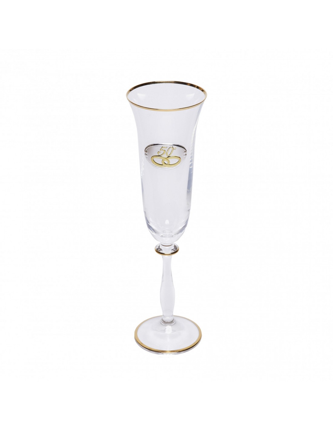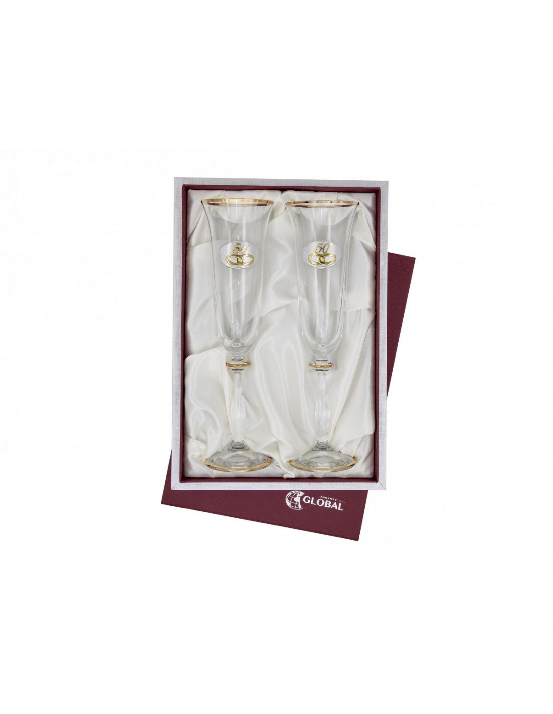 Estuche dos copas cristal champan , placa en plata 50aniversario y borde en dorado . 25 cm altura