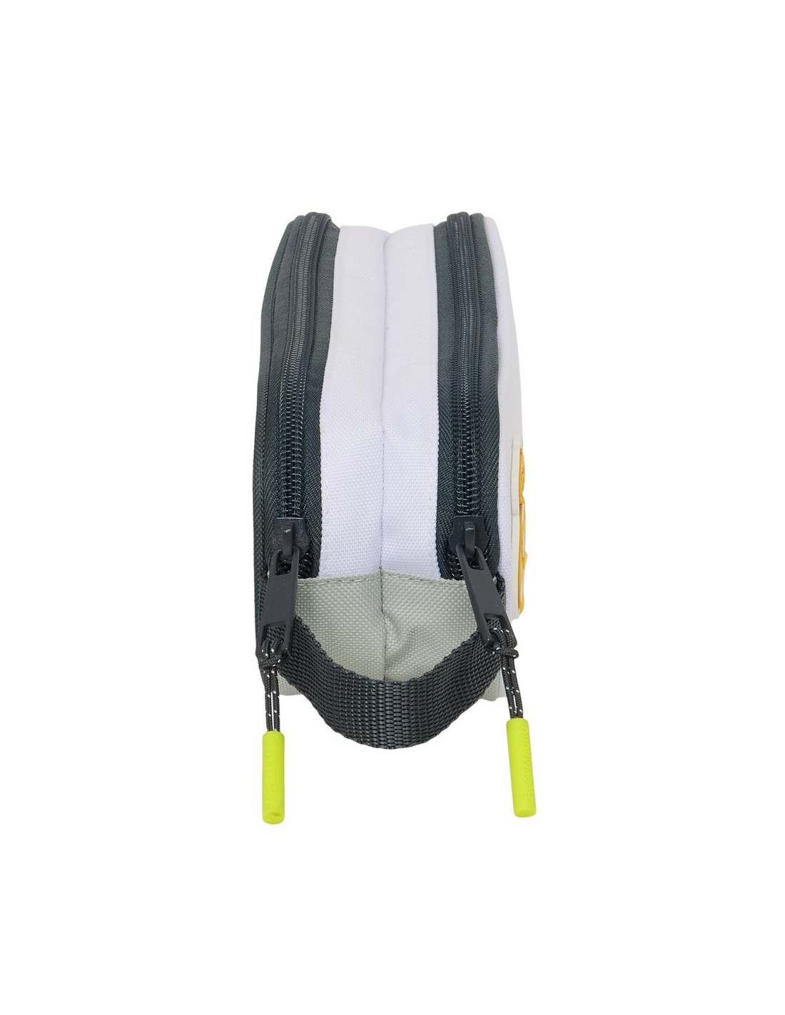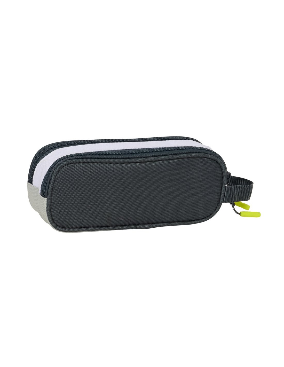 Dos compartimentos separados con cremalleras. Asa de mano en la parte lateral.