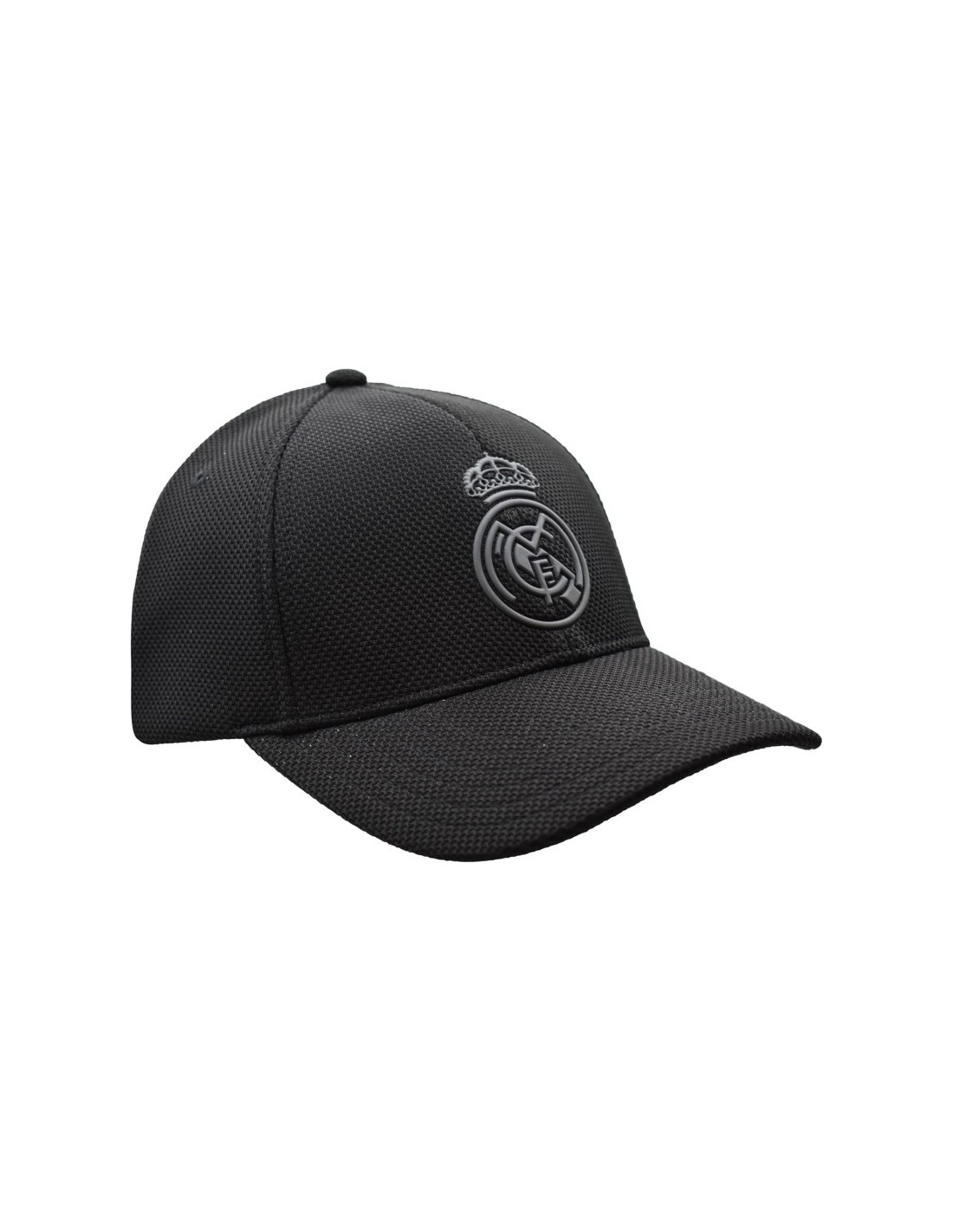 Gorra Real Madrid tejido piqué, talla adulto ajustable, negra escudo engomado.