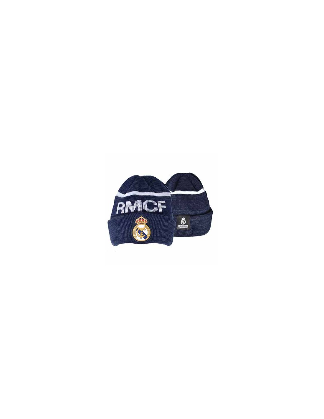 Gorro en color azul tejido con las siglas del club del Real Madrid, junto con el escudo engomado en la parte frontal.