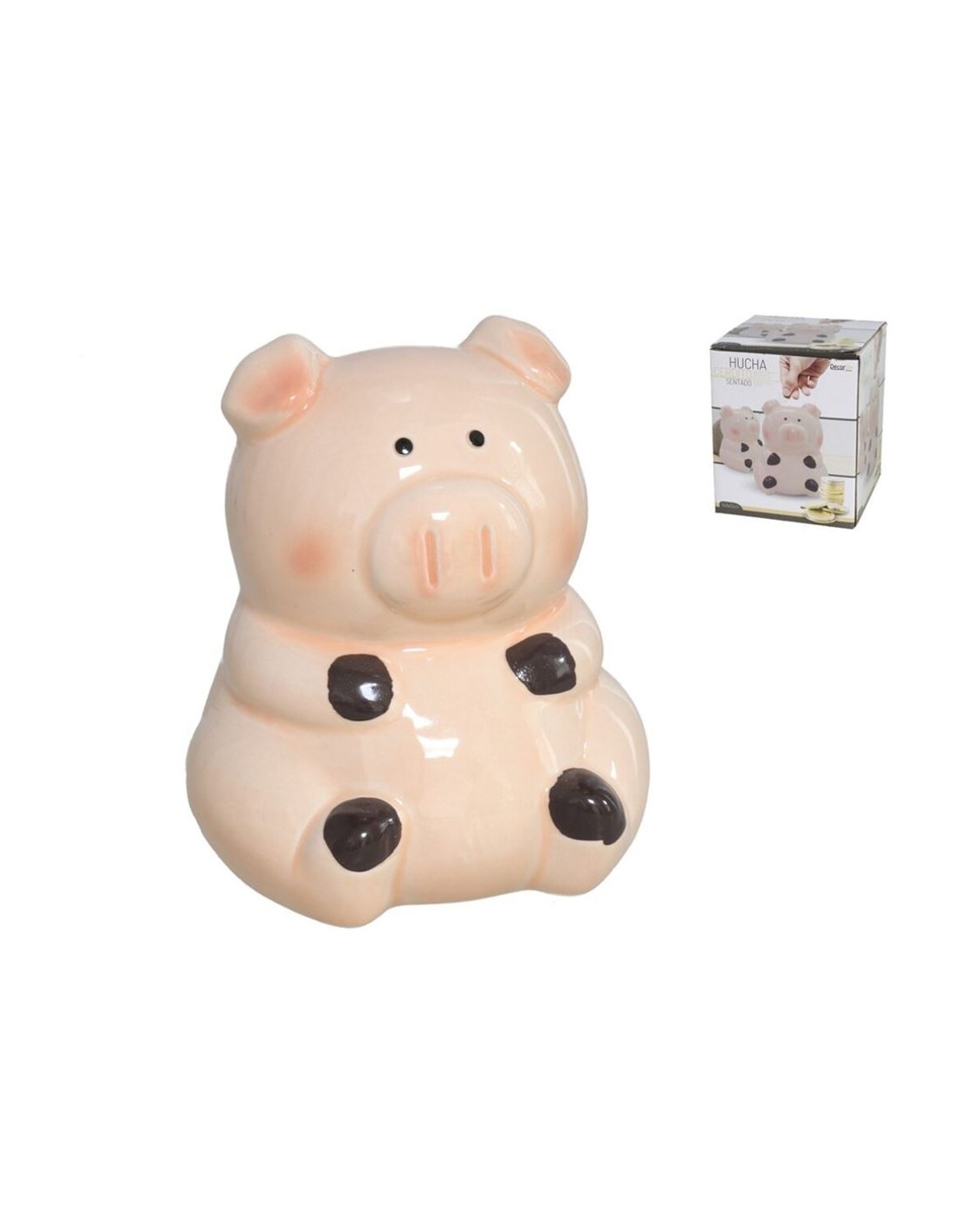 Hucha en forma de cerdito sentado de cerámica barnizada resistente. Tapón en la parte de abajo para extraer tus ahorros.