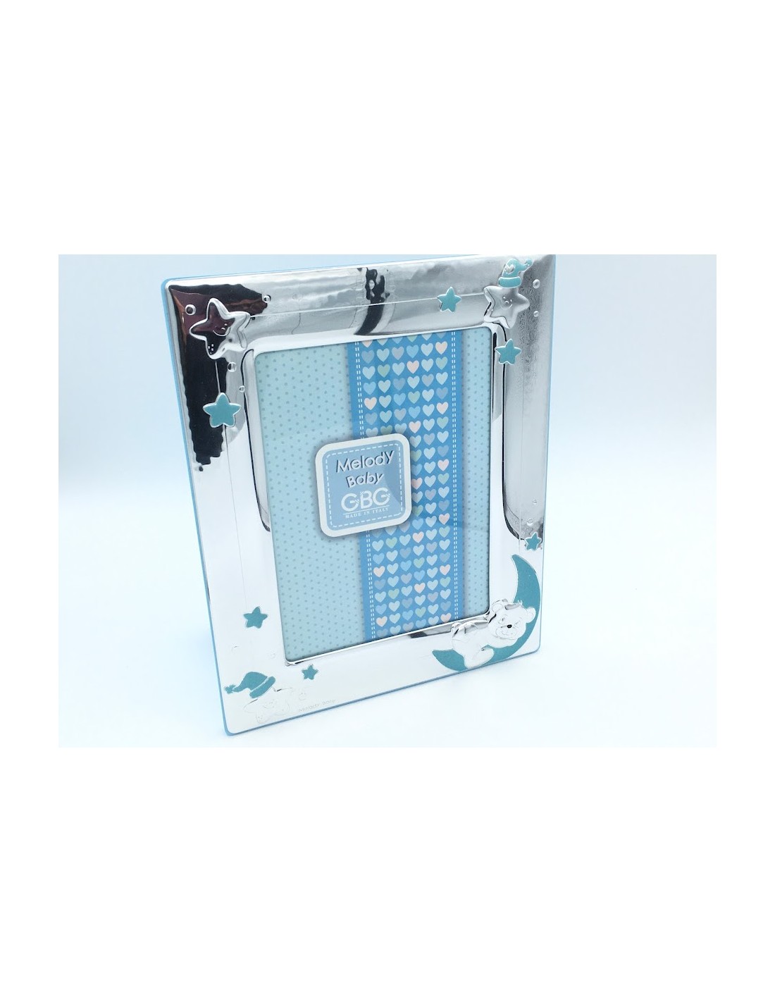 Portafotos plata laminada oso y estrellas azul, parte trasera madera azul.