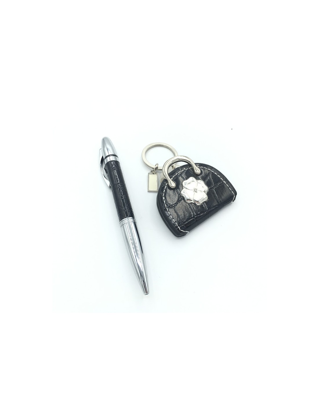 SET BOLIGRAFO Y LLAVERO CON APLIQUE EN PLATA DE LEY NEGRO