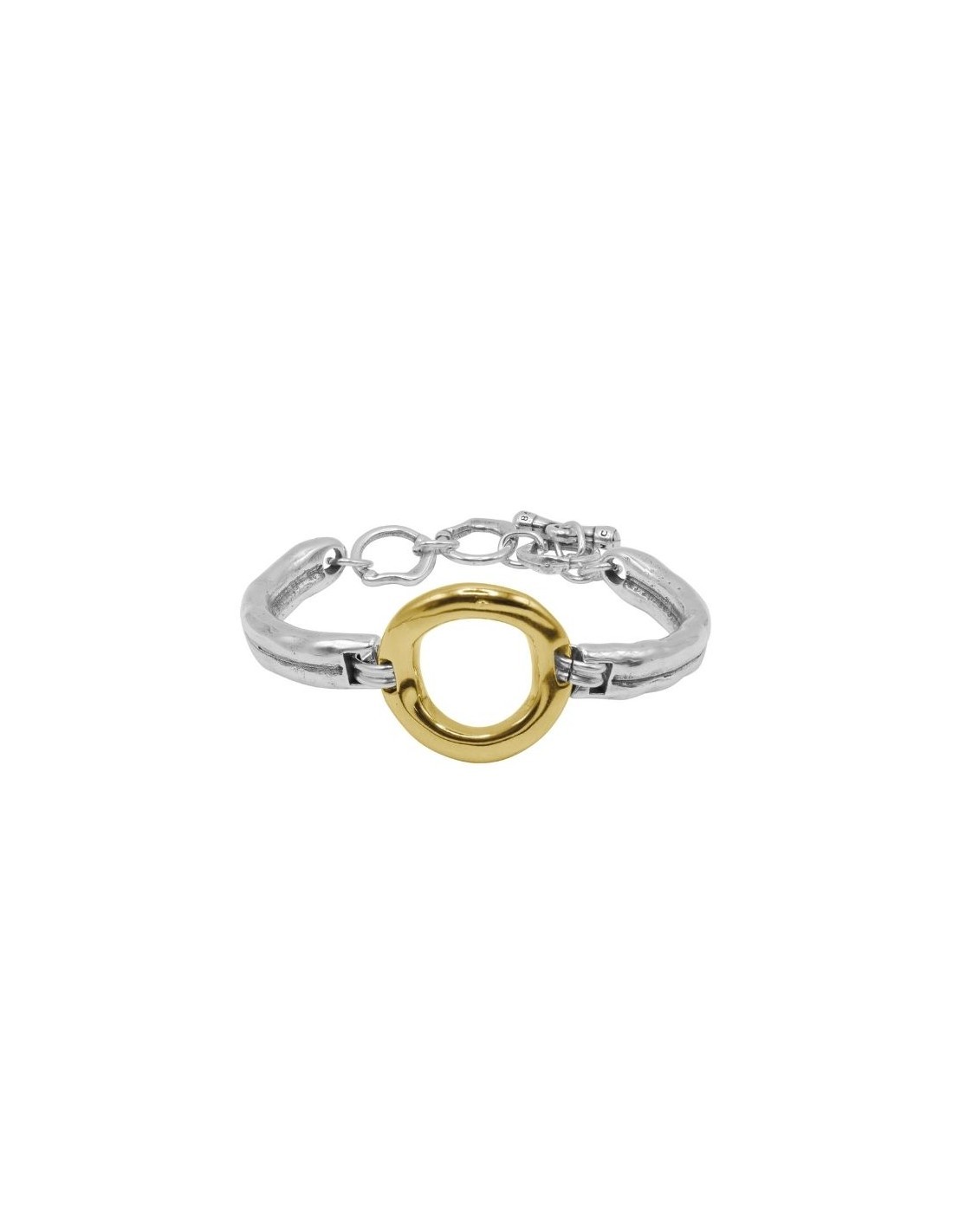La pulsera Hera Gold tiene una estructura semirrígida bañada en plata, pero realza su estilo con un motivo circular central bañado en oro, que aporta un brillo cálido y sofisticado. Mide de 17 a 20 cm y su diseño equilibrado ofrece una pieza versátil y elegante, perfecta para quienes buscan un detalle dorado sin perder la frescura del diseño contemporáneo.