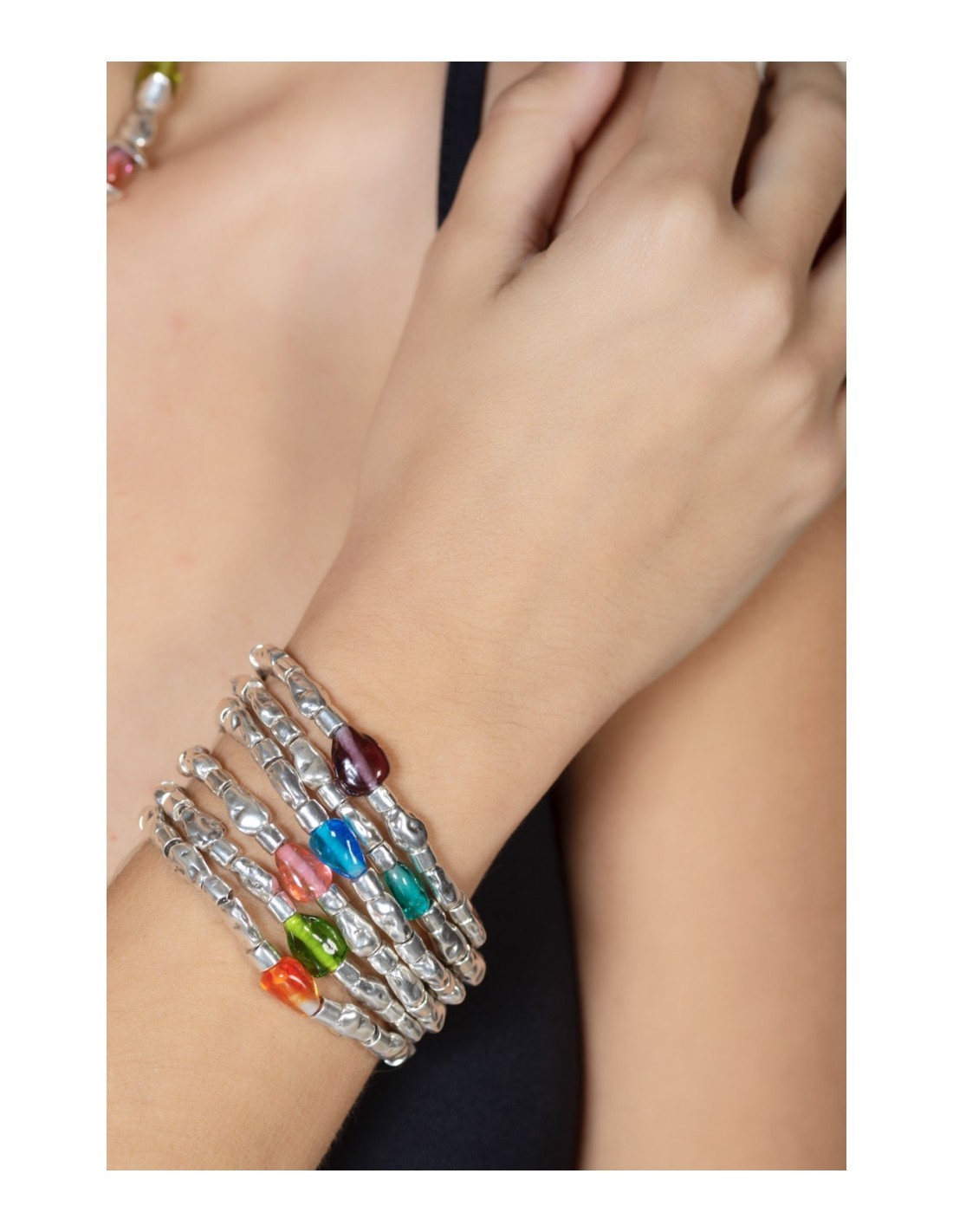 La pulsera Mineral es elástica, con bolitas bañadas en plata y una pepita pequeña de cristal de Murano como detalle central. Disponible en azul, turquesa, morado, verde, rosa y naranja, es una joya ligera, cómoda y llena de color.