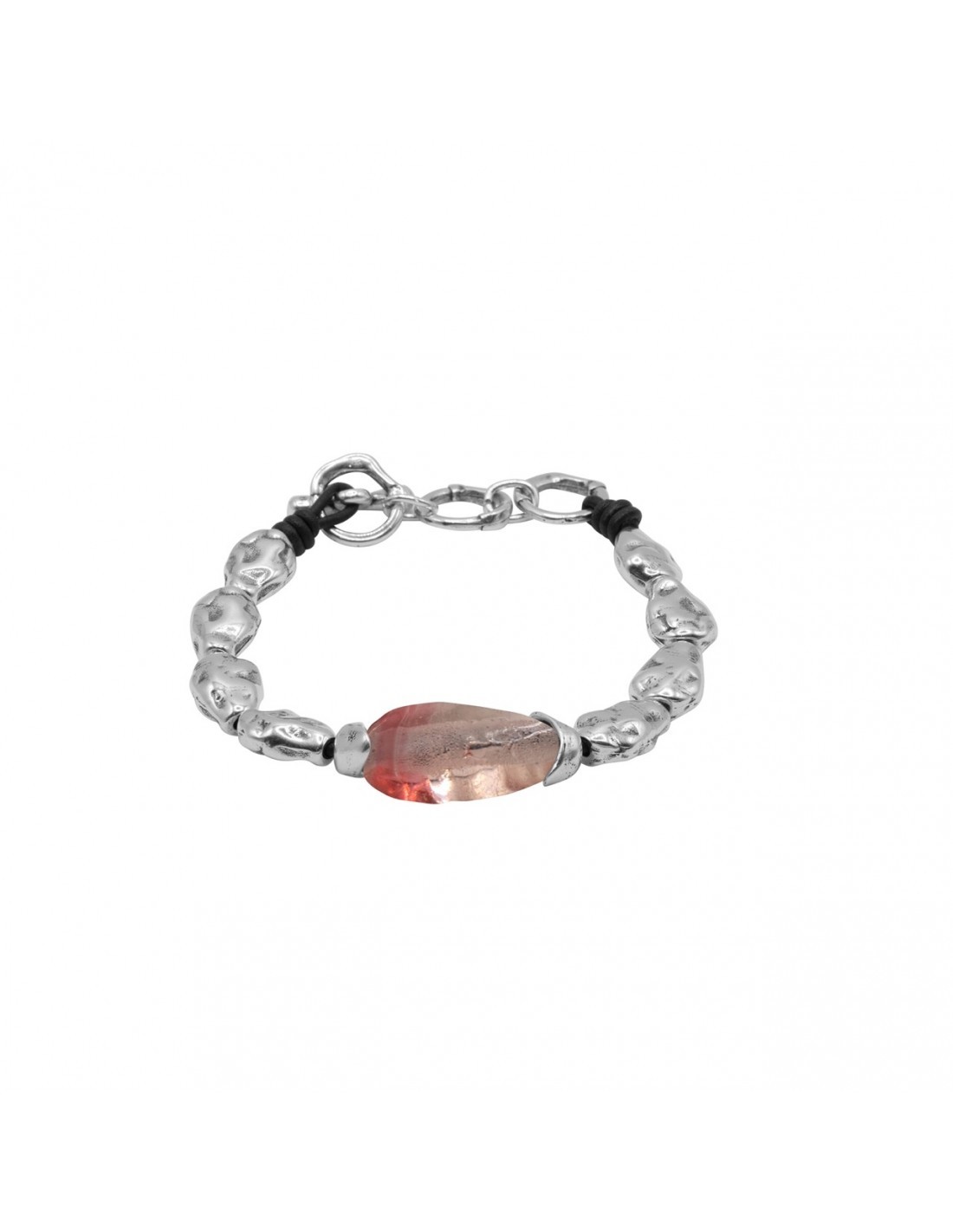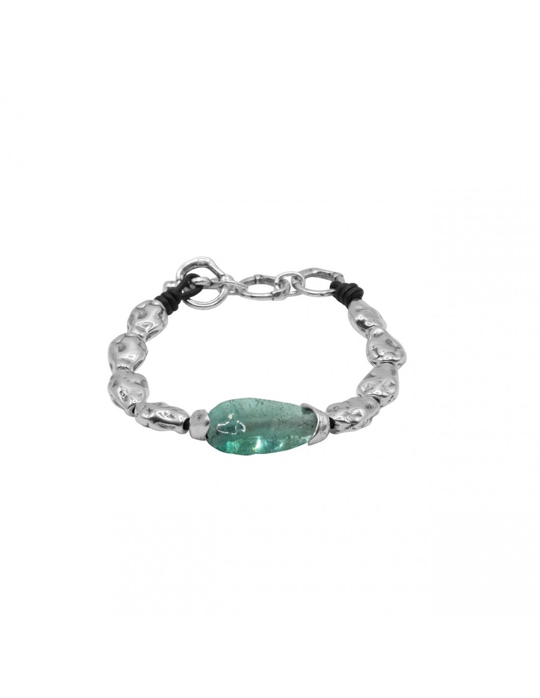 La pulsera Manar está hecha de cuero, con pepitas bañadas en plata y un cristal de Murano en forma de pepita como pieza central. Disponible en azul, turquesa, rosa y ámbar, tiene cierre en T y mide de 17 a 20 cm. Un diseño elegante, cómodo y con mucha personalidad.