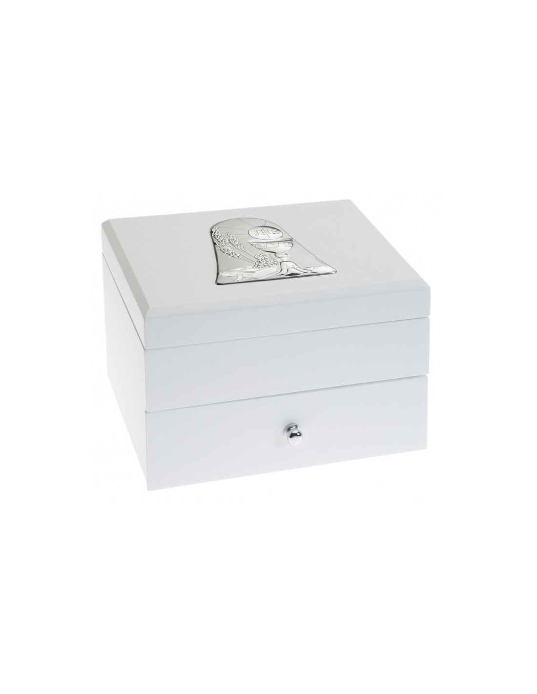 Joyero de madera blanco con aplique de cáliz bilaminado plata de ley.