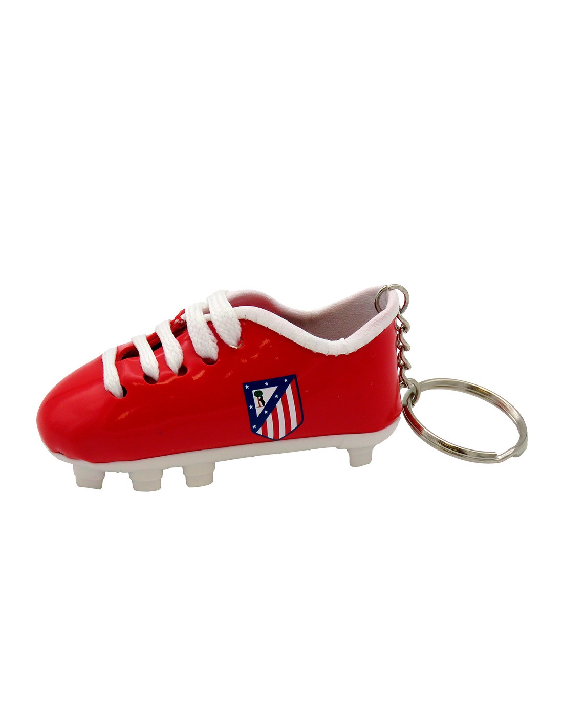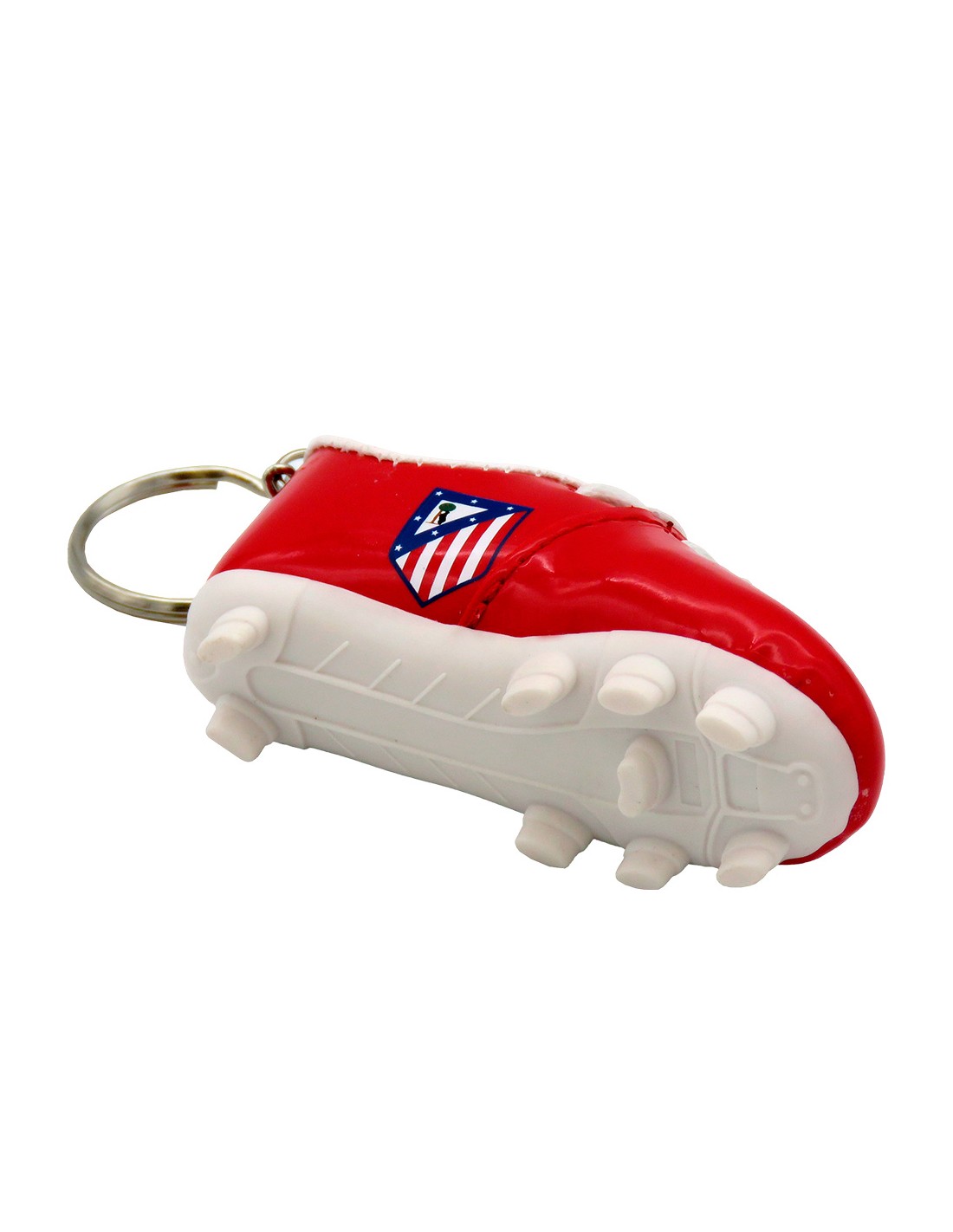 Llavero mini bota de fútbol con escudo Atlético de Madrid en cada uno de sus lados, con argolla metálica que lo une al aro porta llaves.