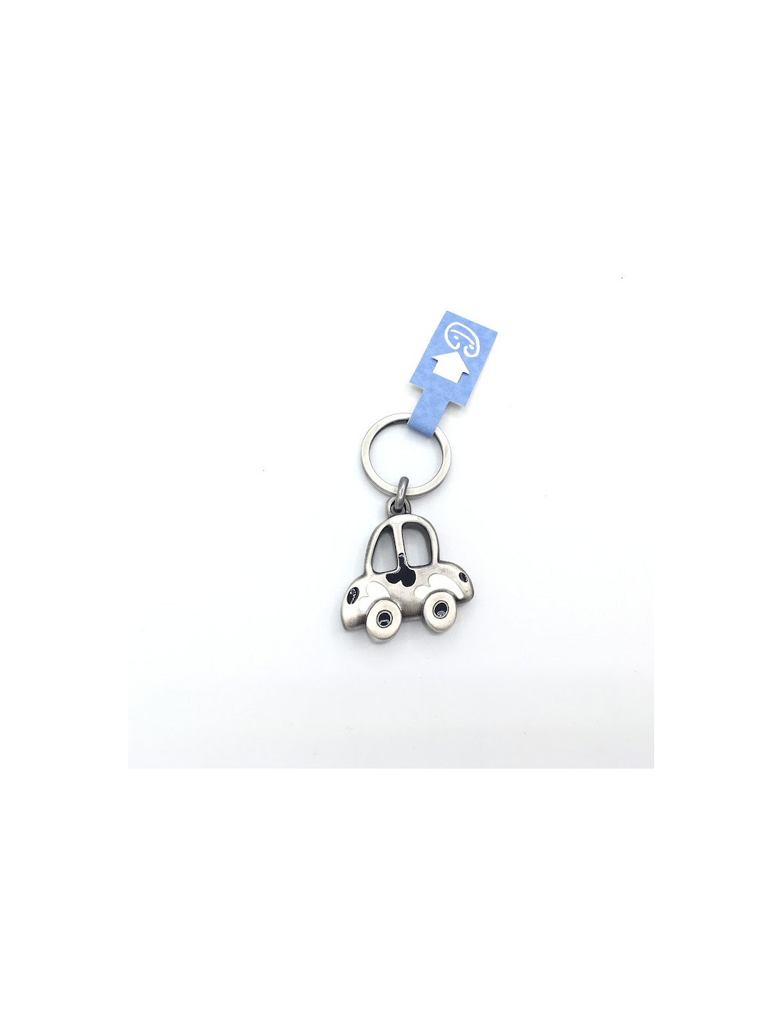 Llavero creativo en forma de coche y dibujos en esmalte blanco y negro.