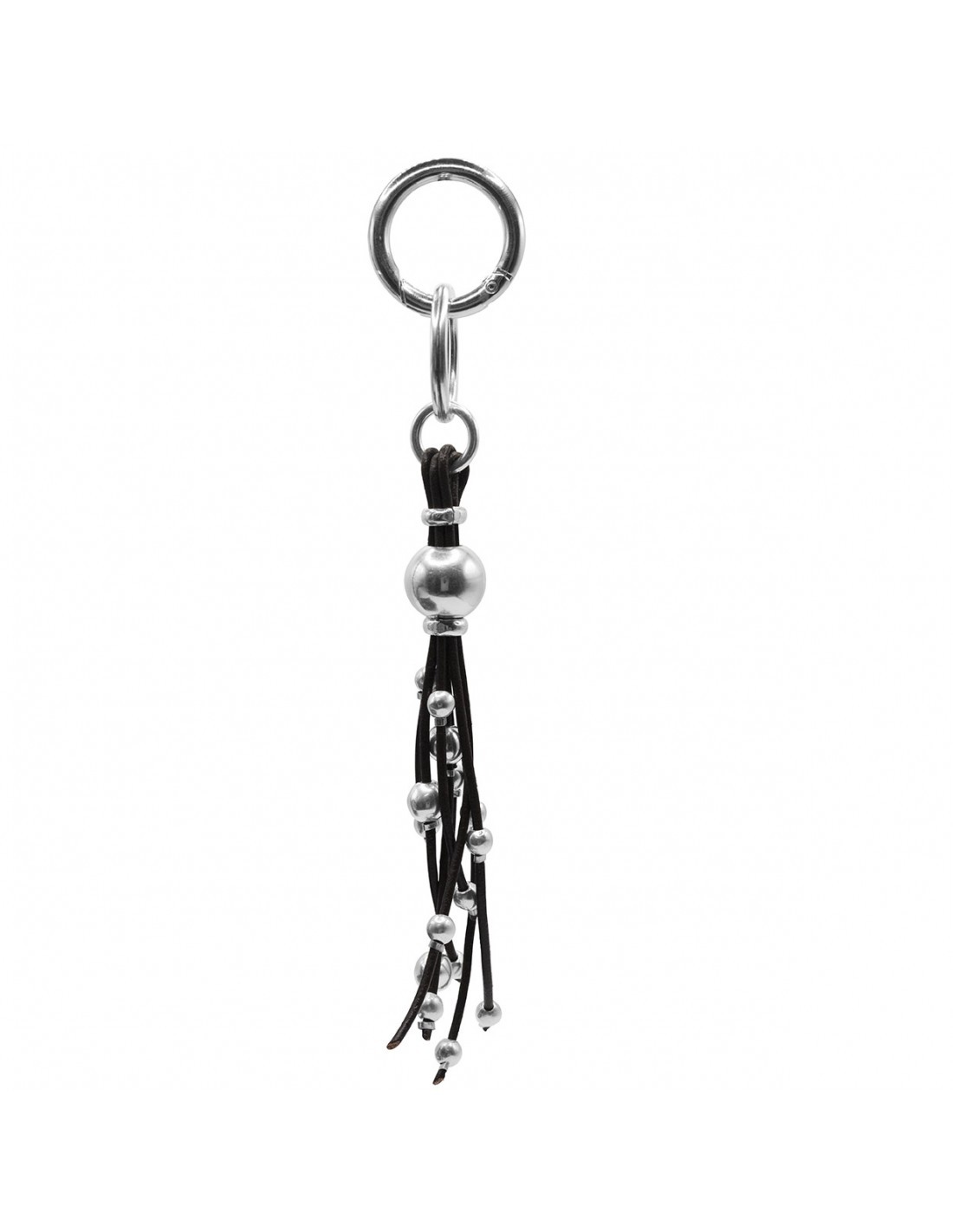 El Llavero o Bag Charm Ástrea está formado por varios cueros que caen como flecos, decorados con bolitas bañadas en plata y una esfera más grande.