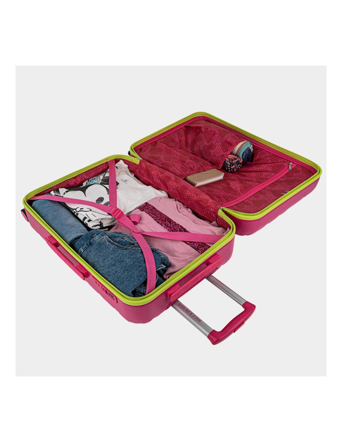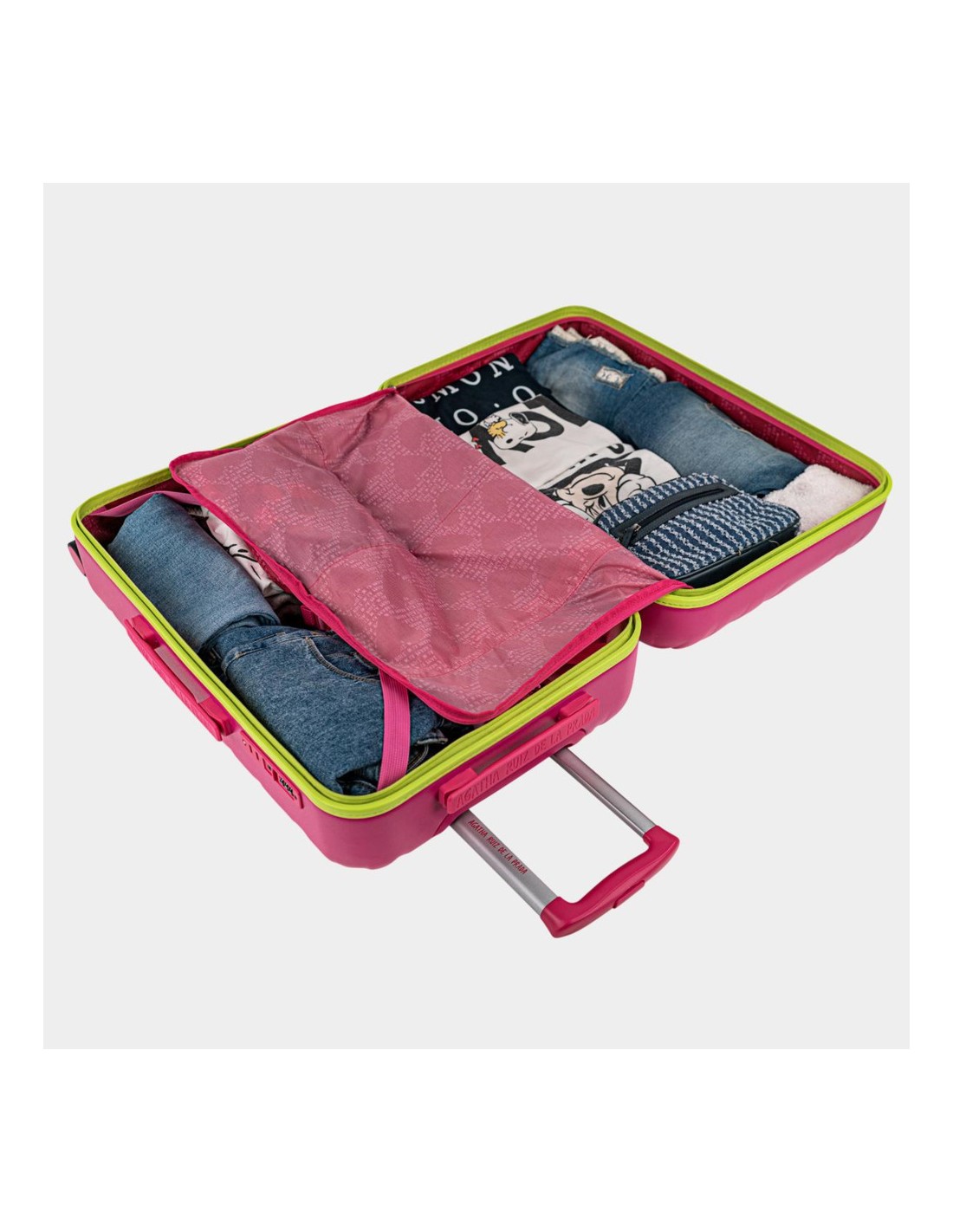 En su interior, con forro estampado de la marca, disponen en una mitad cinta elástica para sujetar la ropa y en otra un separador con cierre de cremallera.