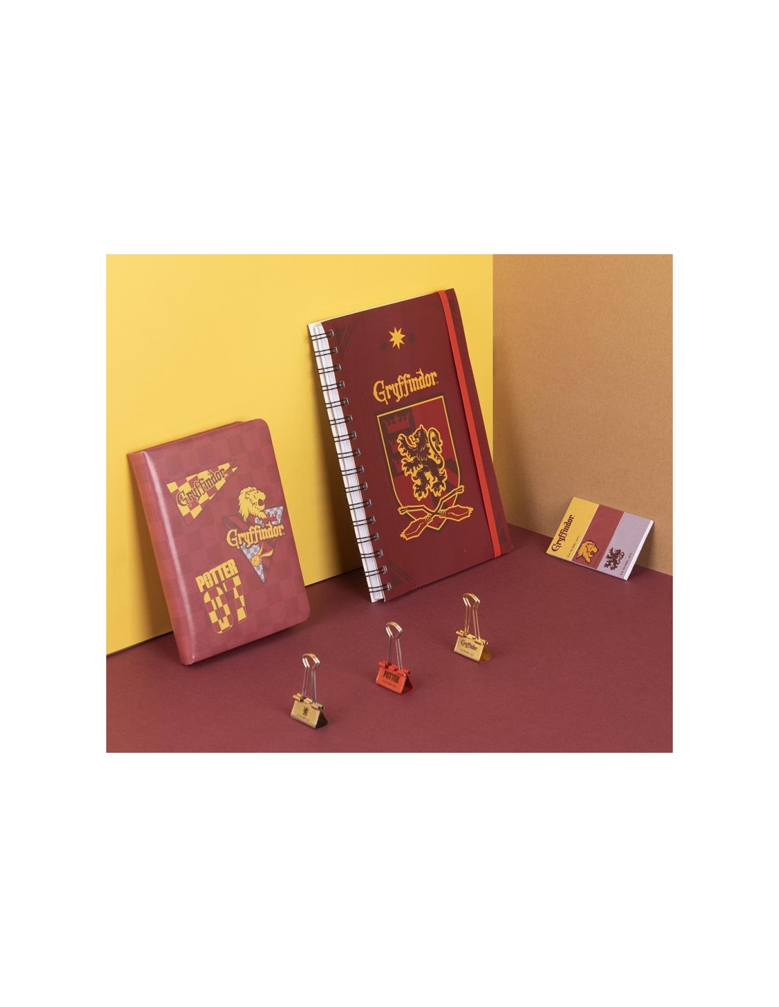 Se trata de un set compuesto por un cuaderno, tres pinzas de metal, un bloc y pósits; con un diseño basado en Gryffindor.
