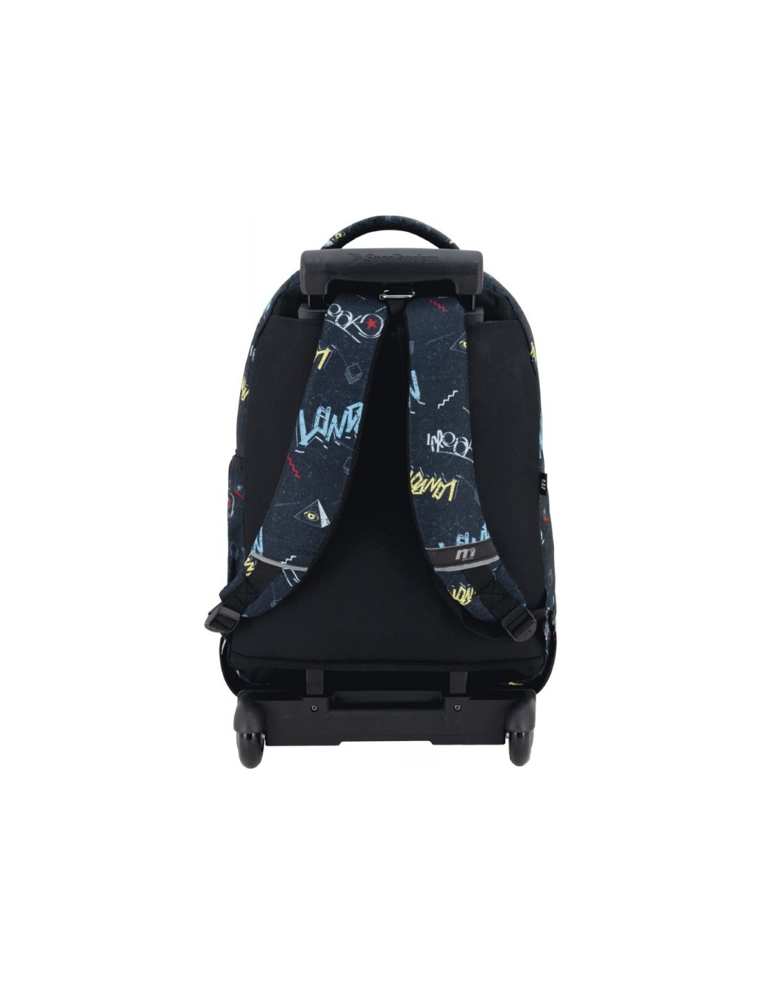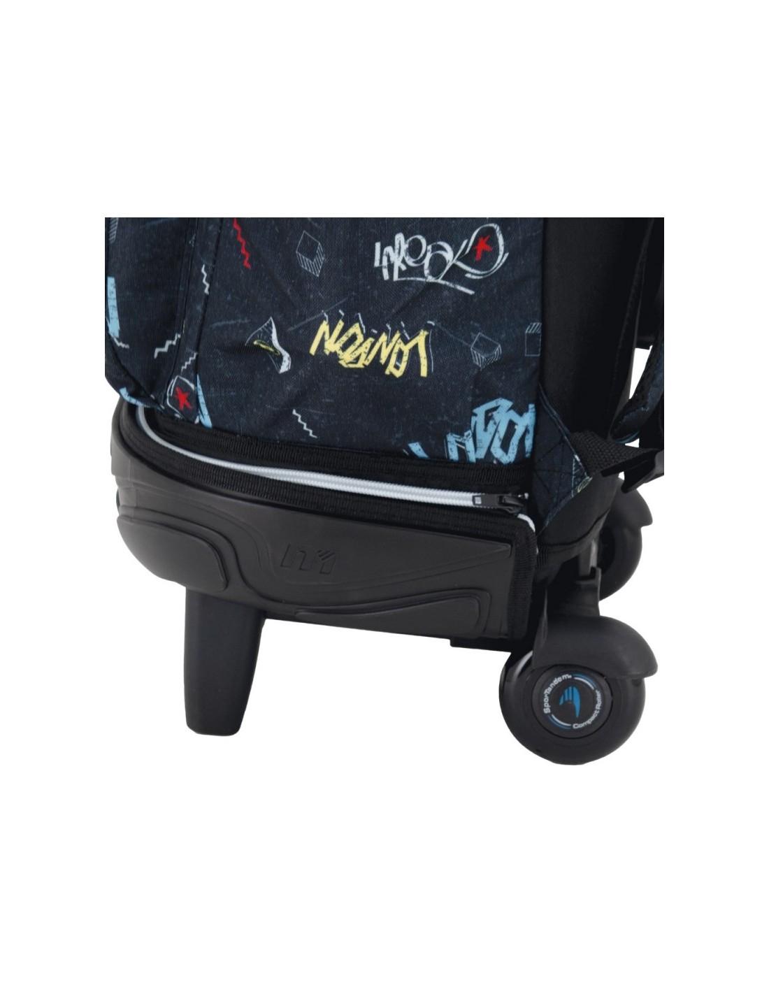 Mochila escolar con carro desmontable. 2 usos en 1: el uso de Carro fijo de base resistente y el otro uso de solo mochila, pues se puede separar del carro a través de la cremallera que los une. Tiene dos compartimientos amplios y un bolsillo frontal con un organizador interno. Tirantes ergonómicos de espuma transpirable con velcro al final que se adhieren al espaldar para que no se arrastren por el suelo. Bolsillo en el lateral derecha para llevar una botella . Asa acolchada de agarre superior. Cuenta con un forro escondido en la parte posterior de la mochila para cubrir las dos ruedas y así evitar que se ensucie la espalda.