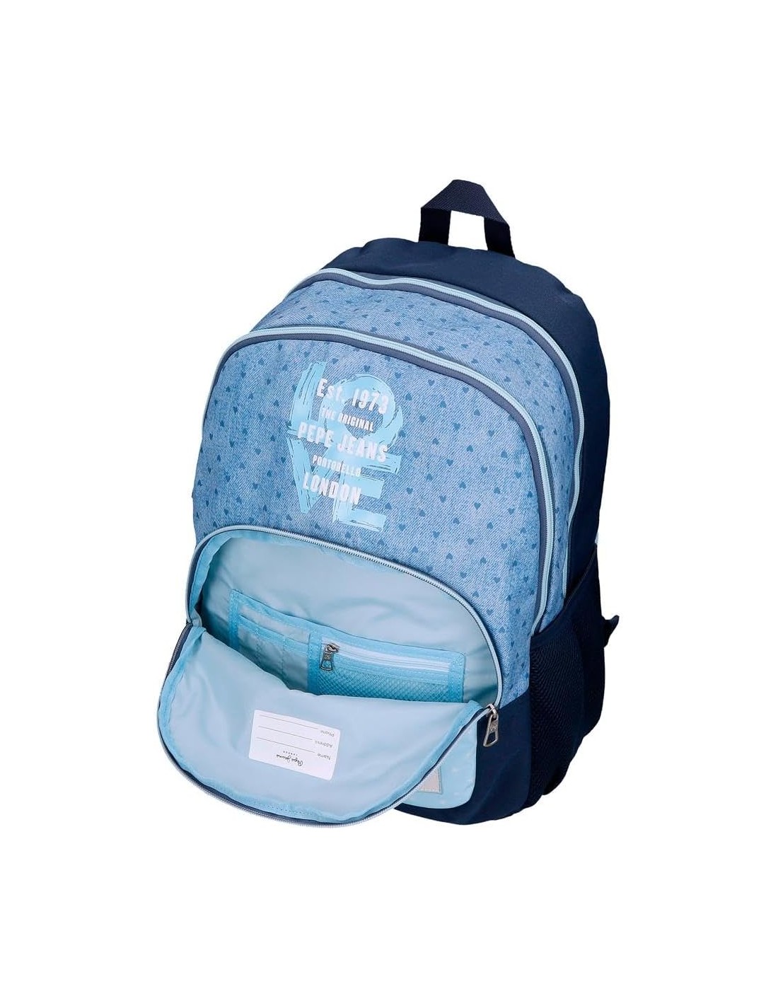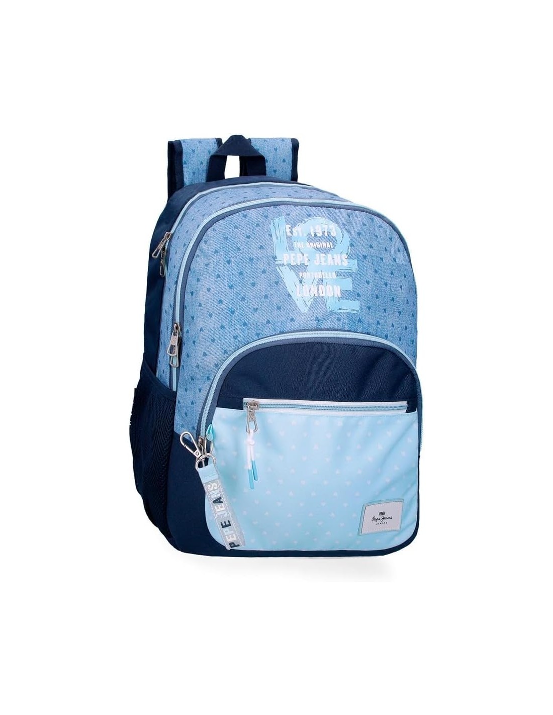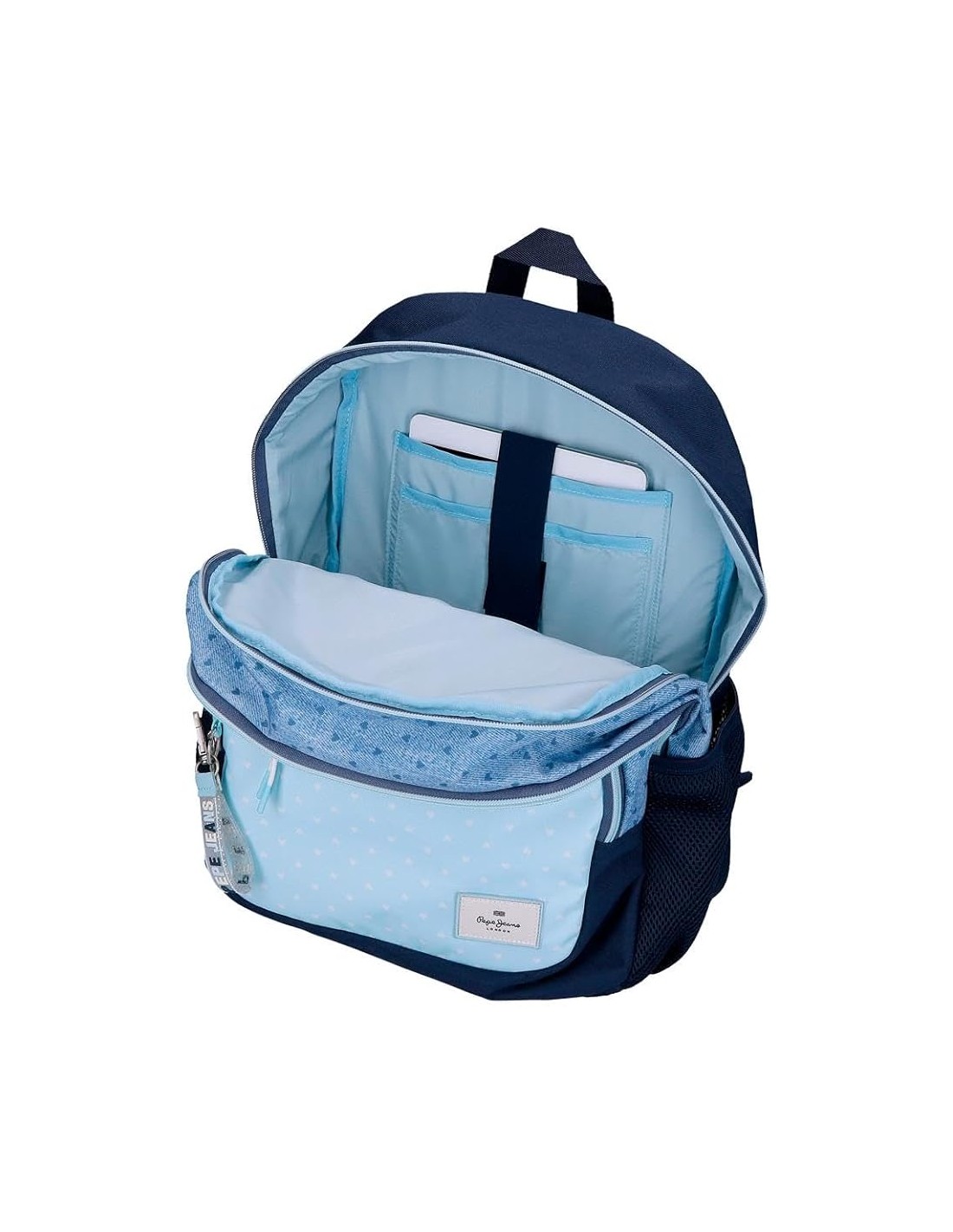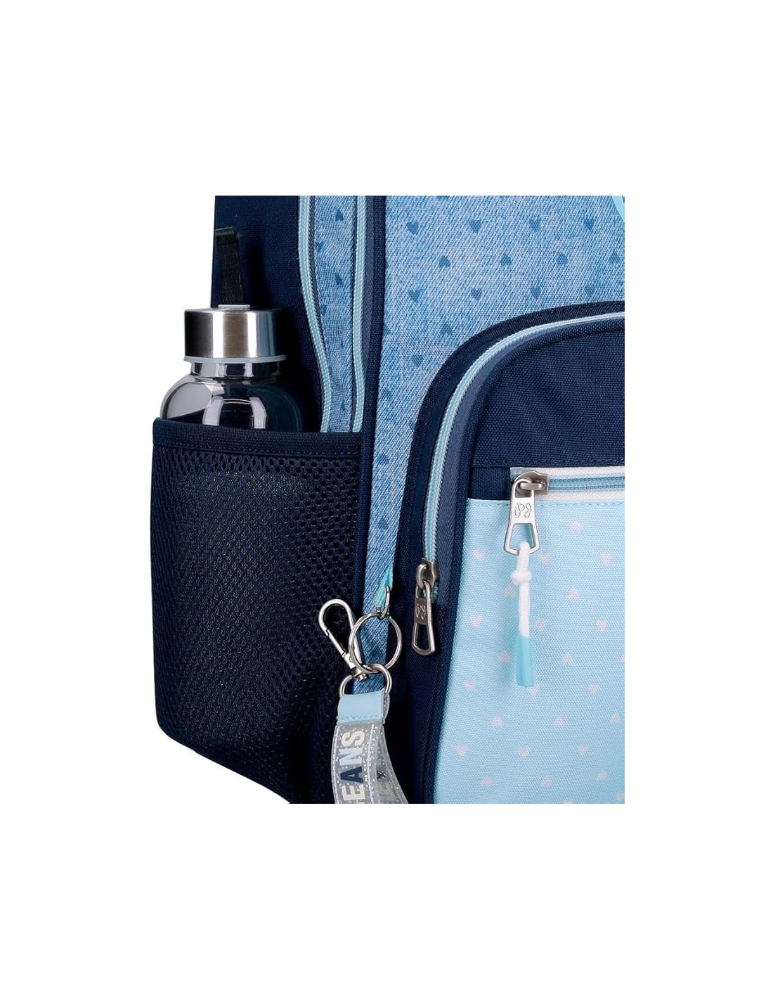 Dos bolsillos frontales de diferentes tamaños y dos bolsillos laterales de red para guardar los pequeños accesorios y el almuerzo.