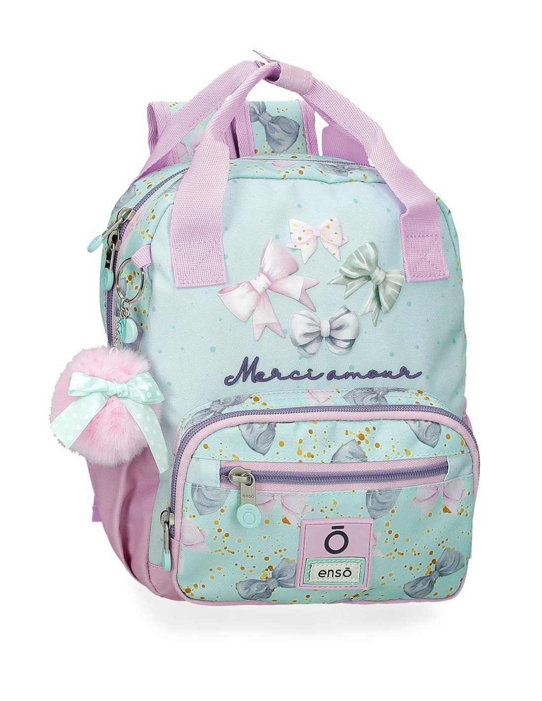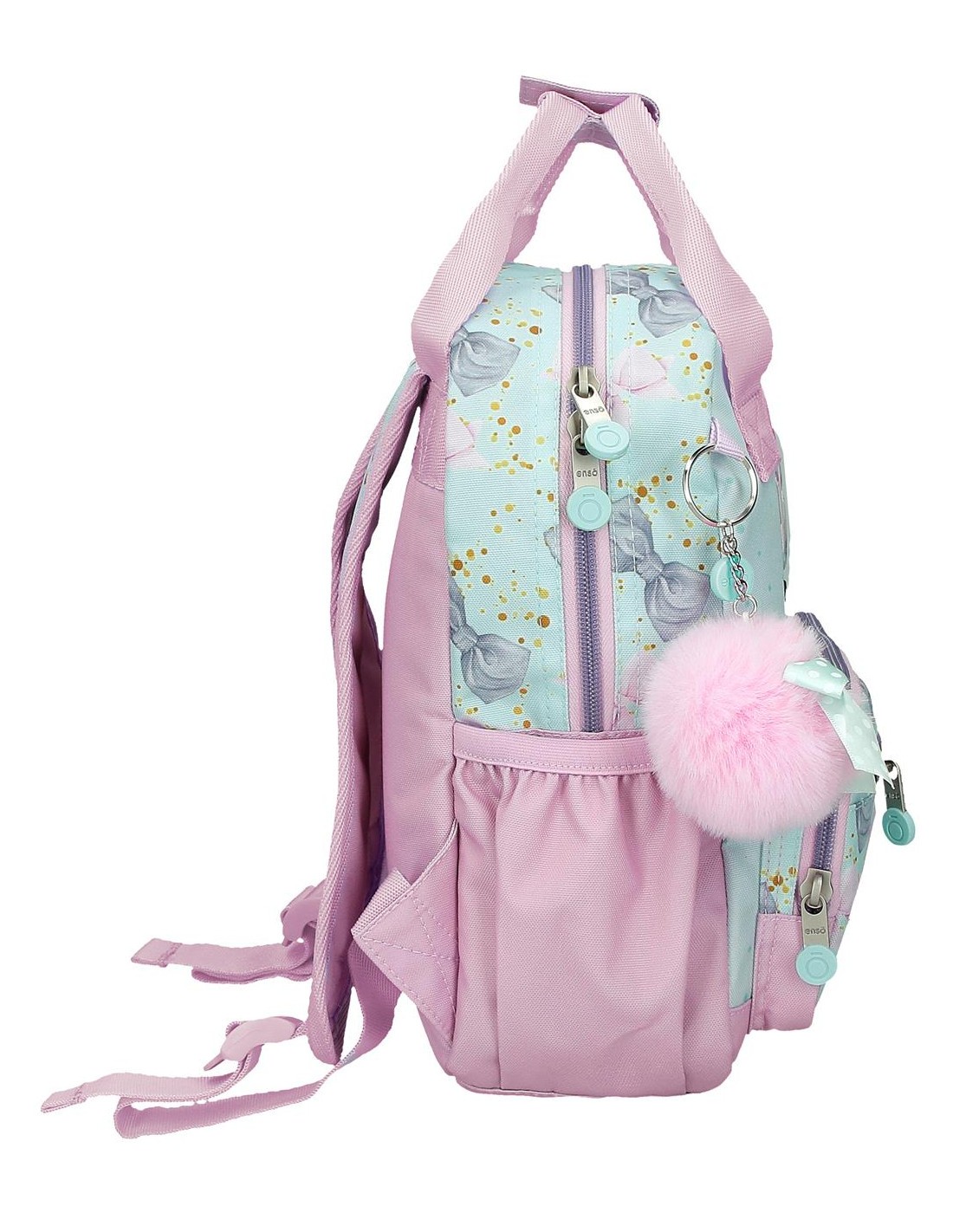 Tirantes ajustables y asas unidas por un click que ofrecen la posibilidad de llevarla tipo mochila o tipo bolso de mano.