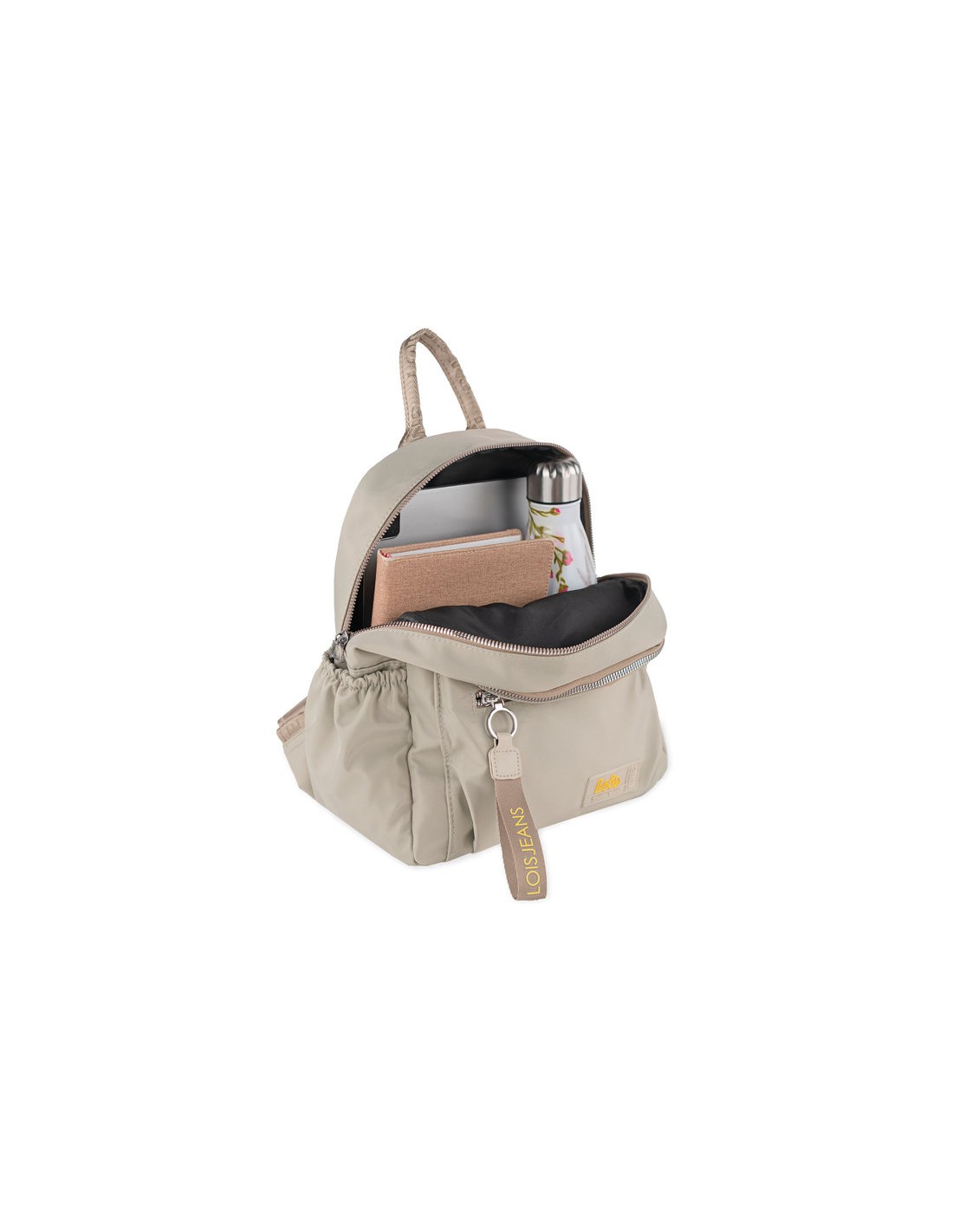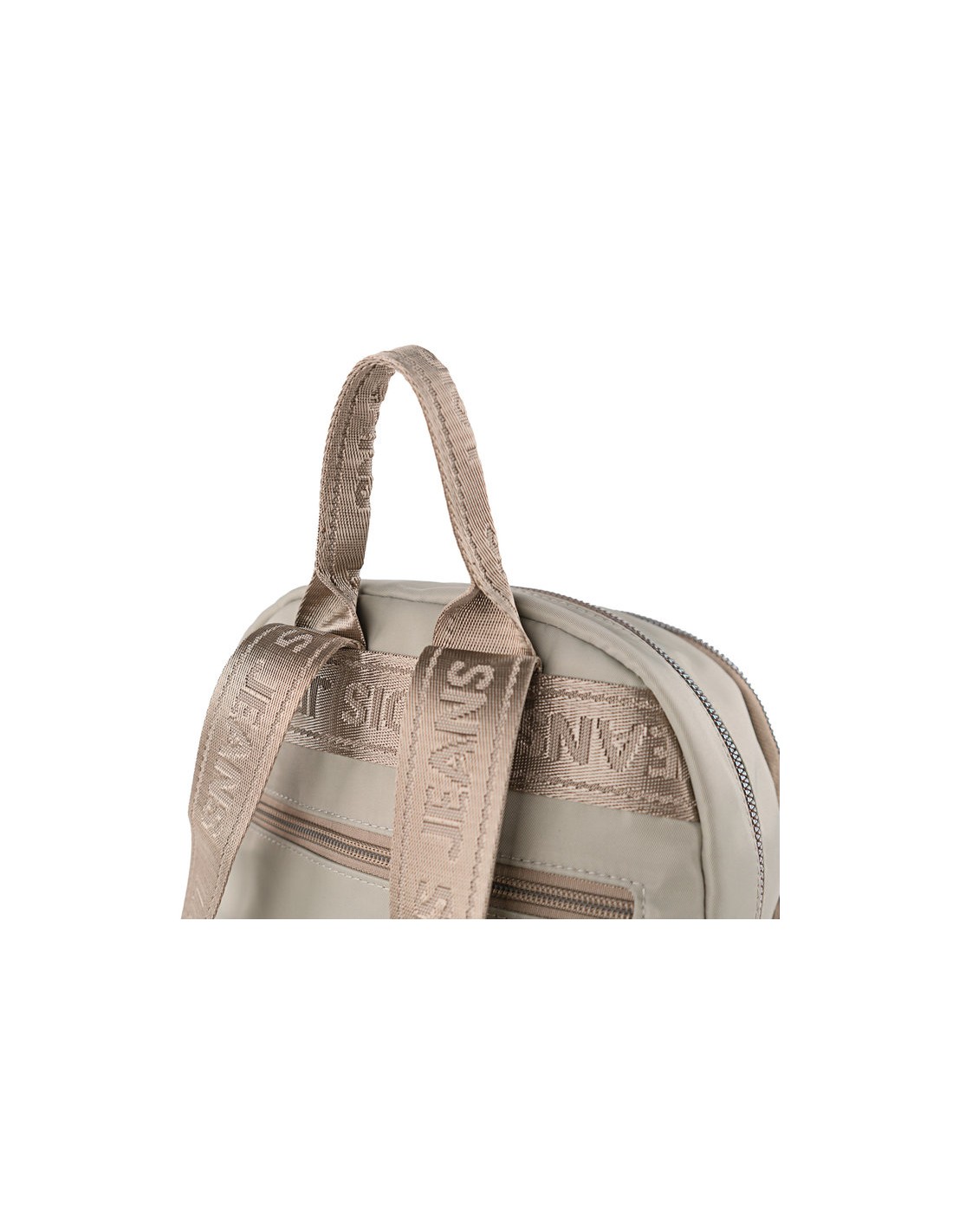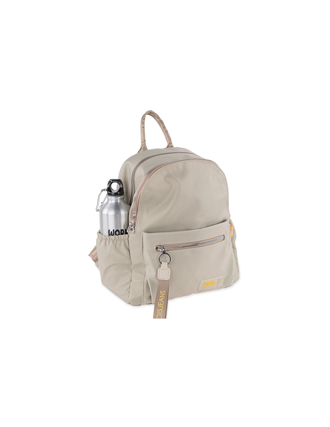 Mochila multifuncional de color beige con asas regulables. Asa de mano superior.