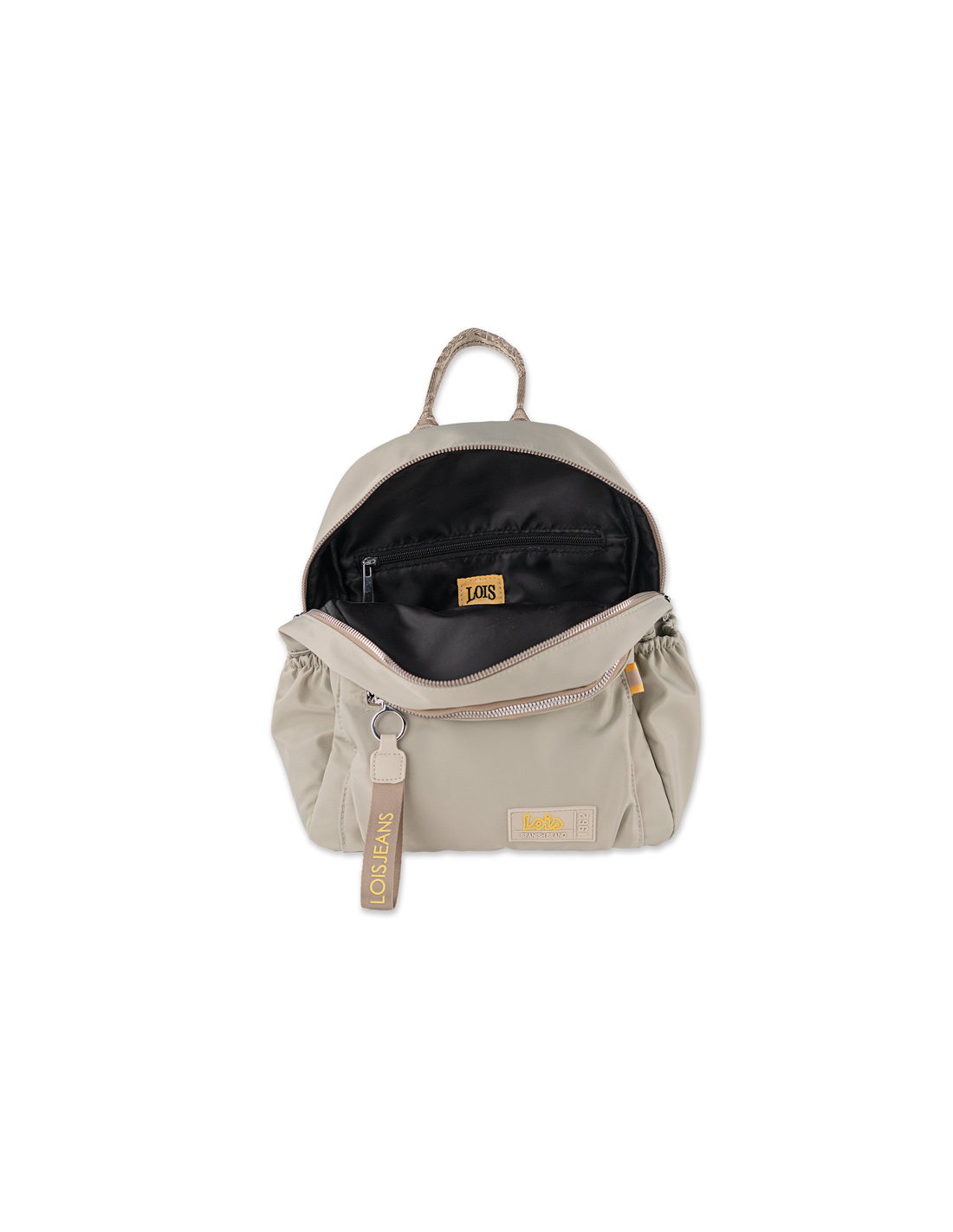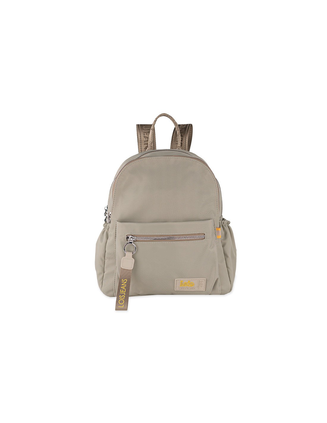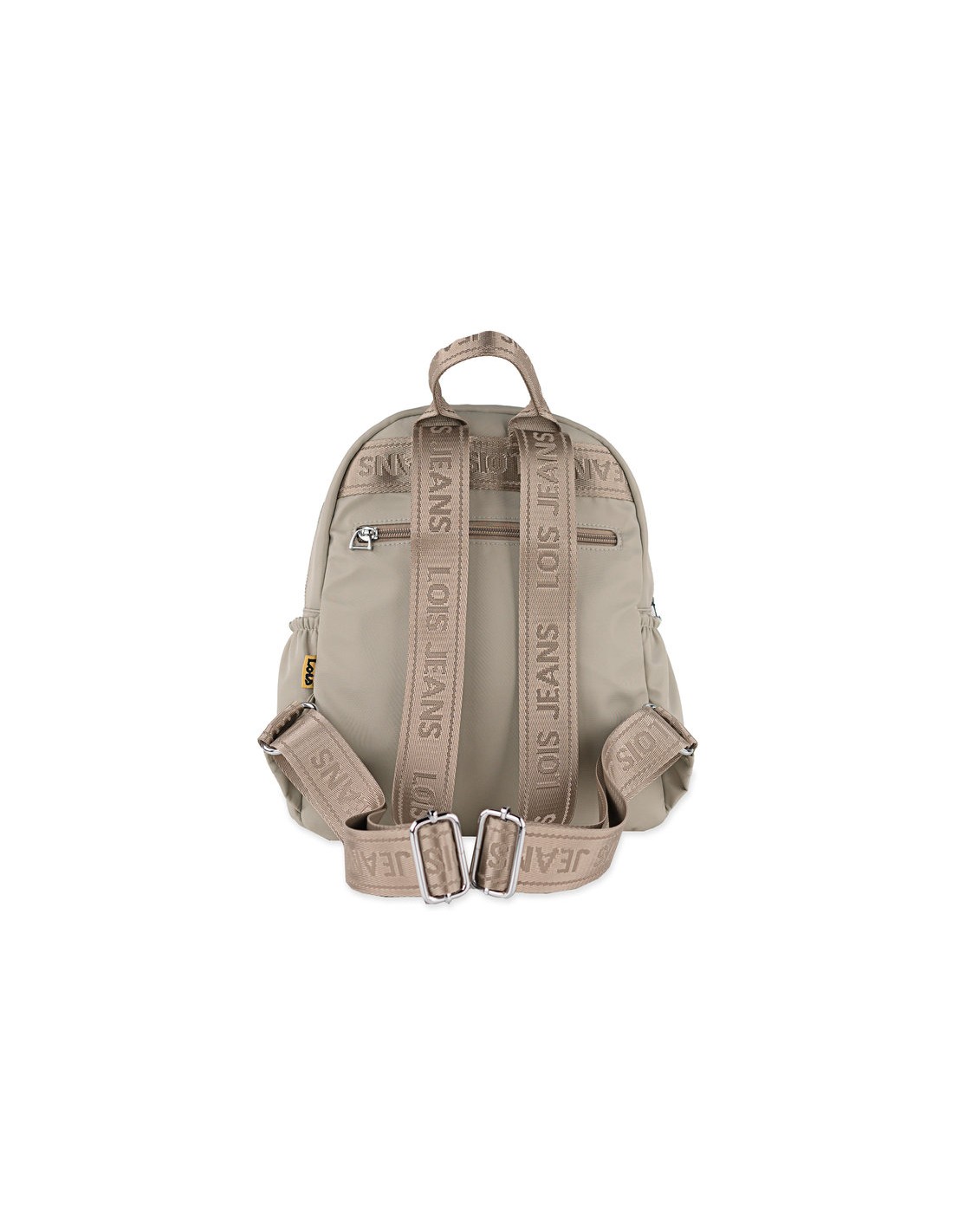 Mochila multifuncional de color beige con asas regulables. Asa de mano superior.