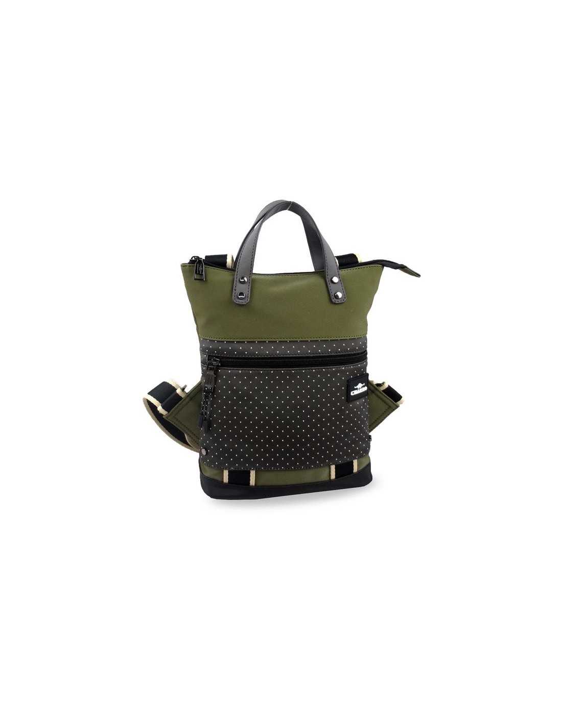 Mochila con asa mujer estampada kaki nylon con compartimento principal protegido por cremallera.